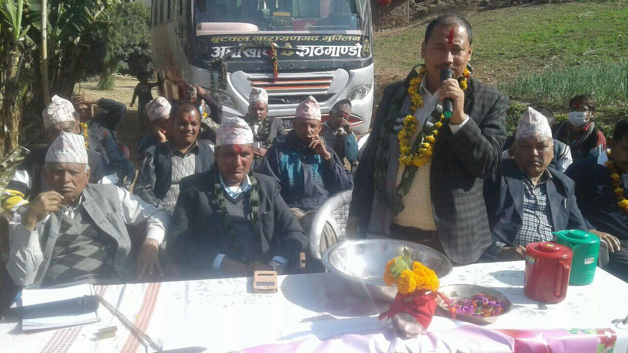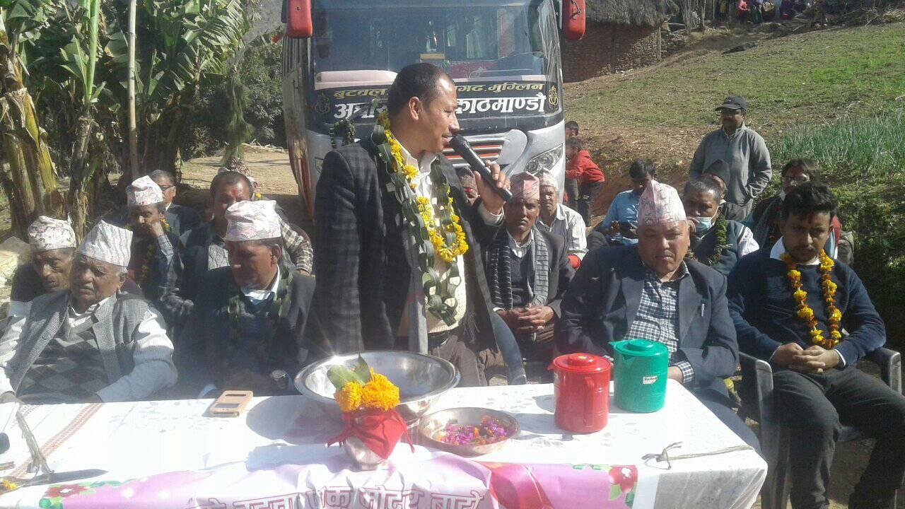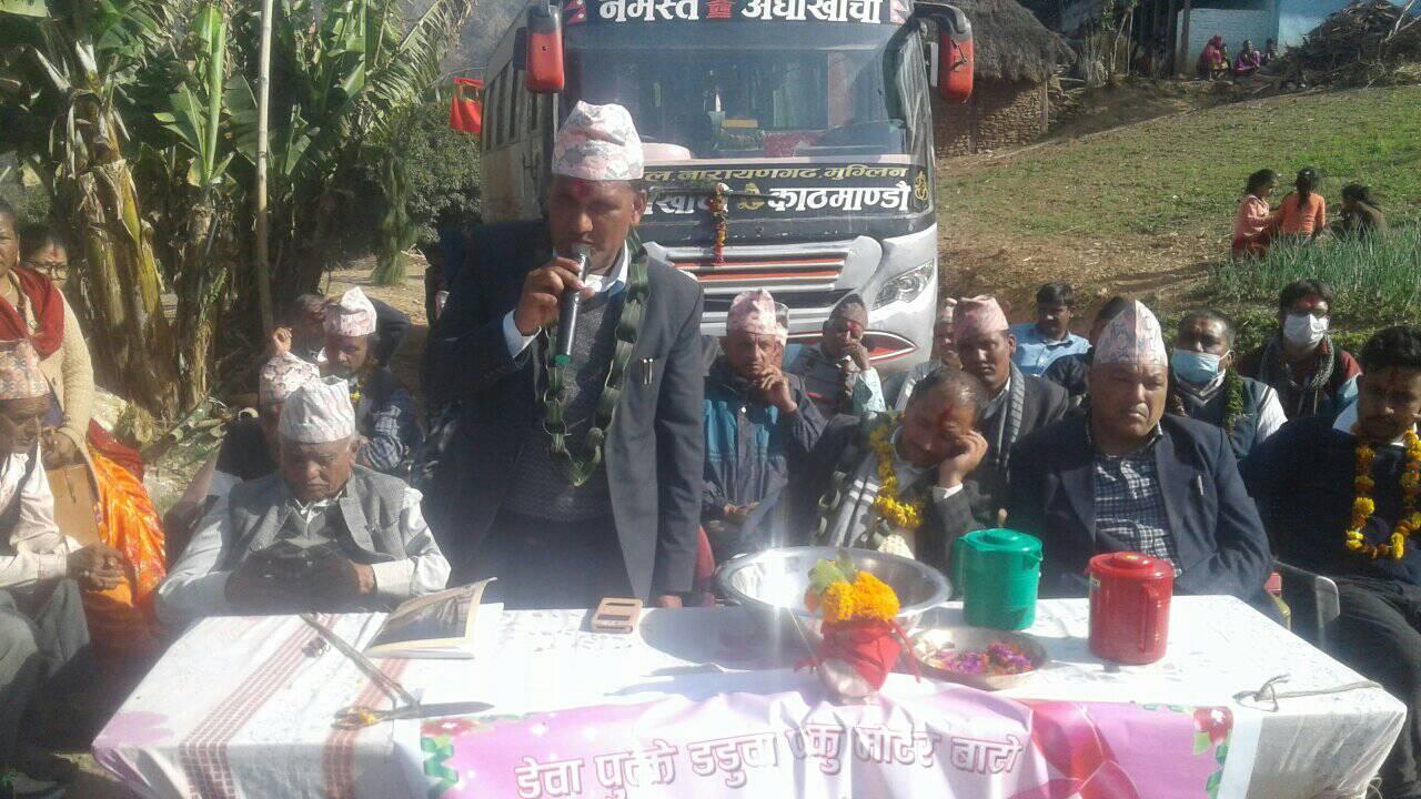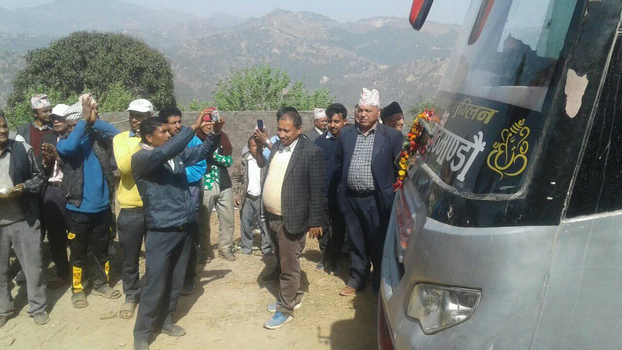 वडाअध्यक्ष खगेश्वर पन्थीको अध्यक्षतामा सम्पन्न कार्यक्रममा स्वागत मन्तव्य वडासदस्य टाम लाल भट्टराईले राख्नु भएको थियो । भने कार्यक्रमको सञ्चालन ईश्वरी प्रसाद मरासेनीले गर्नु भएको थियो । पहिलो पटक बस आगमनवाट गाउँलेहरूले खुसियाली व्यक्त गरेका थिए ।