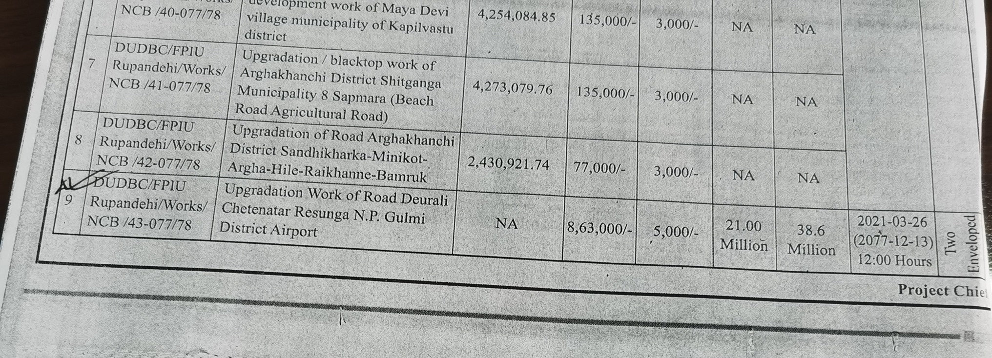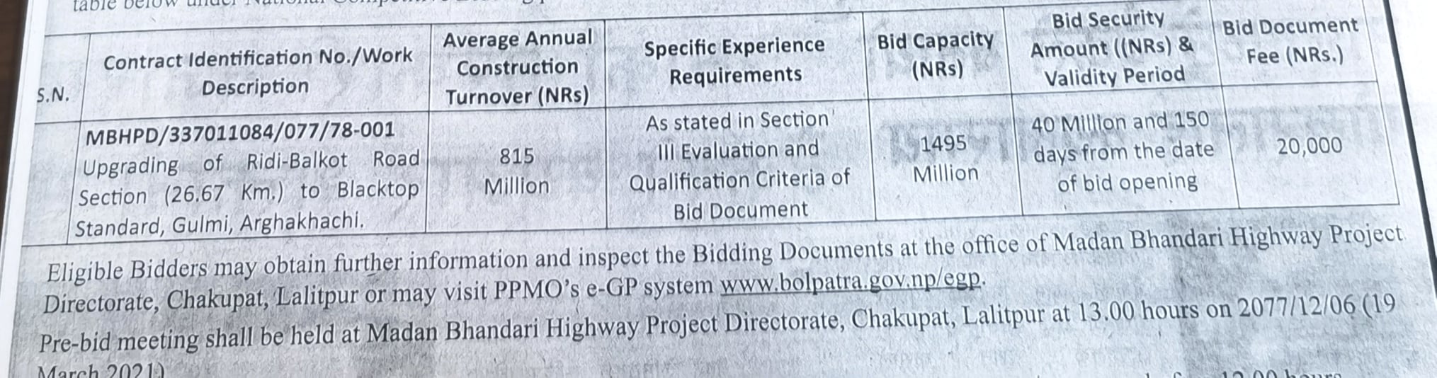 जिल्लाको बल्कोट – रिडी, सन्धिखर्क – अर्घा मिर्लिङकोट- अर्घा हिले – बामरुक, सालझण्डी ढोरपाटन सडक, शितगंगा नगरपालिका वार्ड नम्बर ८ जलुकेको सापमारा सडकमा कालो पत्रे गर्न  टेन्डर आह्वान भएको हो ।