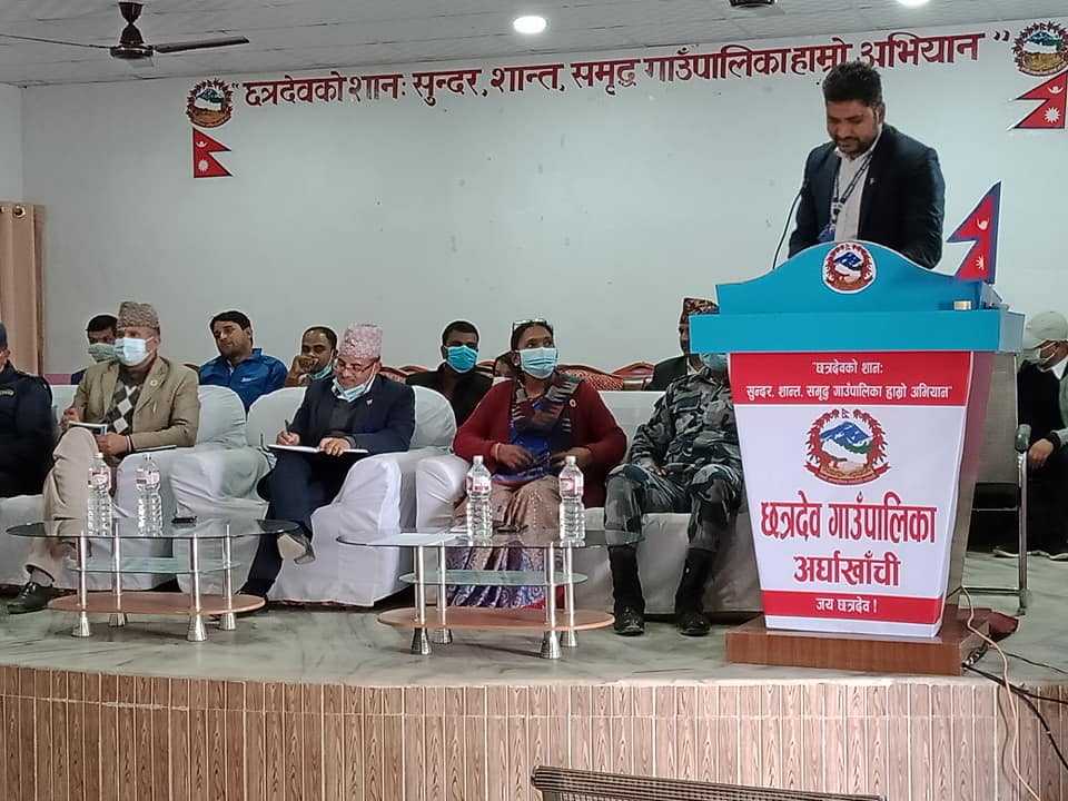 छत्रदेव गाउँपालिकाका जन प्रतिनिधि , वडा सचिज तथा अन्य सरोकारवालाको उपस्थिति रहेको कार्यक्रममा प्रमुख जिल्ला अधिकारी विष्णु पौडेल , प्रहरी नायव उपरिक्षक माधब बुढाथोकी र सहायक प्रमुख जिल्ला अधिकारी विनोद खनालले जिल्ला प्रशासन कार्यलय र सुरक्षा समितिले गर्ने कामहरुको बारेमा जानकारी गराउनु भएको थियो ।