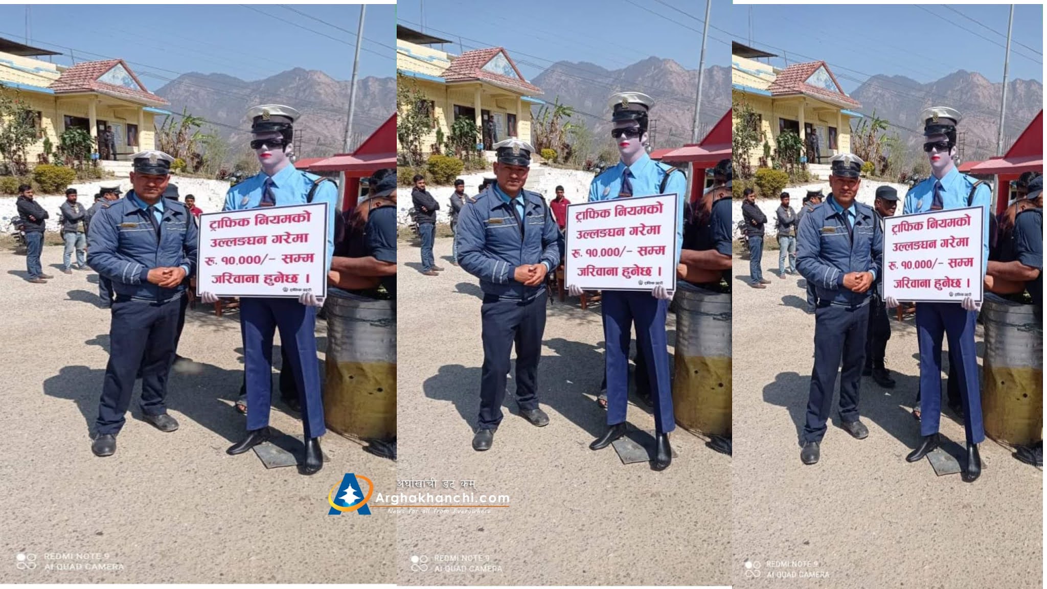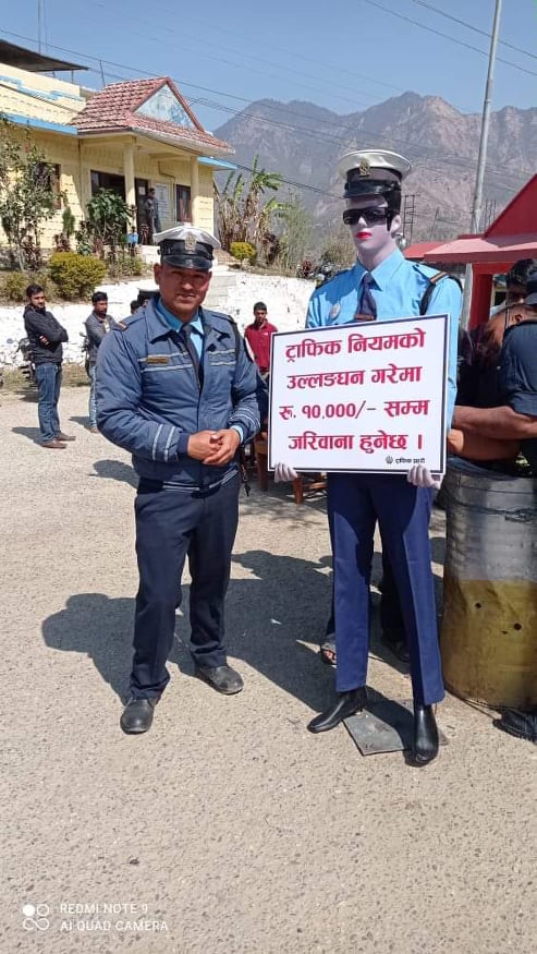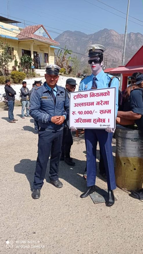 डमी ट्राफिक प्रहरीका हातमा ट्राफिक नियम उलंघन गरेमा १०,००० जरिवाना भन्ने सन्देश समेत लेखिएको छ।