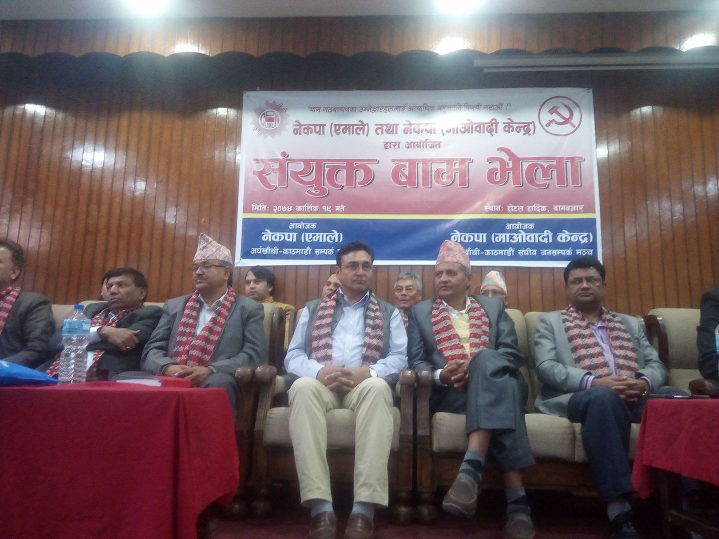 फाइल फोटो: नेकपा एमाले र माओवादी केन्द्र अर्घाखाँची – काठमाडौं सम्पर्कमञ्को संयुक्त बाम भेला काठमाडौंमा २०७४ कार्त्तिक १९, आइतवार ।