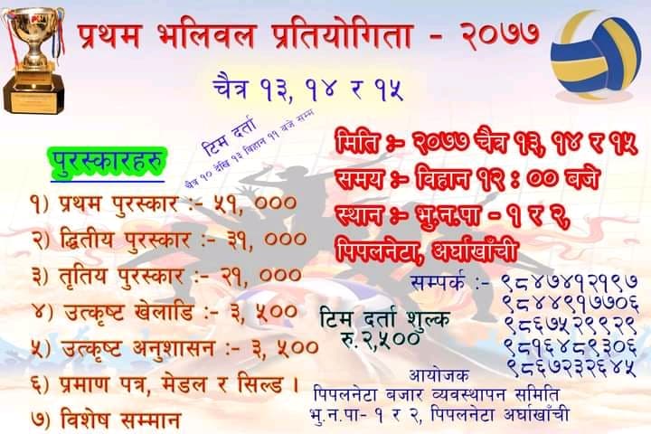ढाकावाङको पीपलनेटामा आगामी चैत्र १३ गतेदेखि १५ गतेसम्म प्रथम खुल्ला भलिबल  प्रतियोगिता  २०७७ हुने भएको हो ।