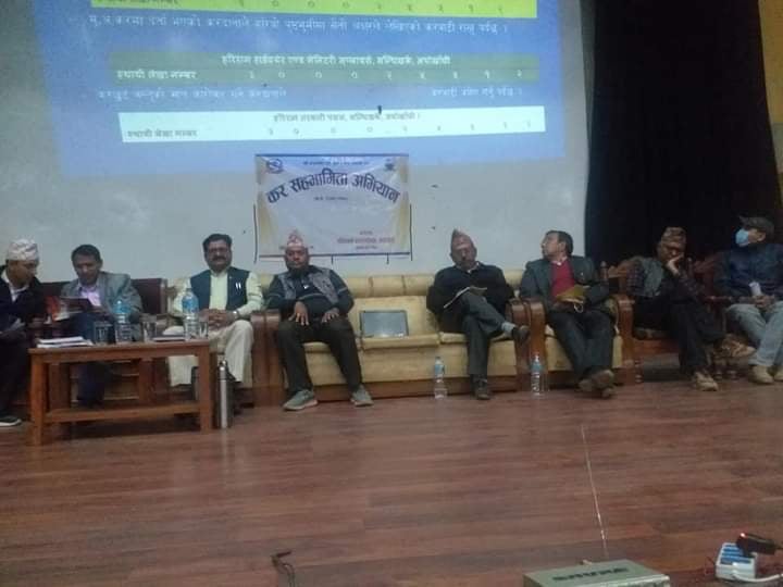नगर उपप्रमुख तथा राजस्व परामर्श समितिका अध्यक्ष ठाकुर कुमार बिकको अध्यक्षता , सन्धिखर्क नगरपालिका राजस्व शाखाका प्रमुख मुक्ति खनालको सन्चालन , नगर प्रबक्ता तथा सन्धिखर्क वार्ड नम्बर ३ का वार्ड अध्यक्ष लिलाराम गौतम को स्वागत मन्तब्यबाट सुरु भएको कार्यक्रममा सन्धिखर्क नगरपालिकाका प्रमुख प्रशासकिय अधिकृत कृस्न प्रसाद सापकोटा , उधोग बाणिज्य संघका पुर्व केन्द्रीय सदस्य कृष्ण प्रसाद श्रेष्ठ , उधोग बाणिज्य संघका जिल्ला अध्यक्ष युवराज श्रेष्ठ , चेम्बर अफ कमर्सका महेन्द्र सेजवाल , करदातासेवा कार्यलय का लक्ष्मीप्रसाद आचार्य , सन्धिखर्क नगरपालिकाका १२ वटा वार्डका अध्यक्ष हरु , कार्यपालिका सदस्य हरु , नगरसभा सदस्य हरु, उधोगि , ब्यापारी , पत्रकार र कर्मचारीहरुको उपस्थितिमा जिल्ला समन्वय समिती अर्घाखाँचीको सभाहलमा कार्यक्रम सम्पन्न भएको हो ।