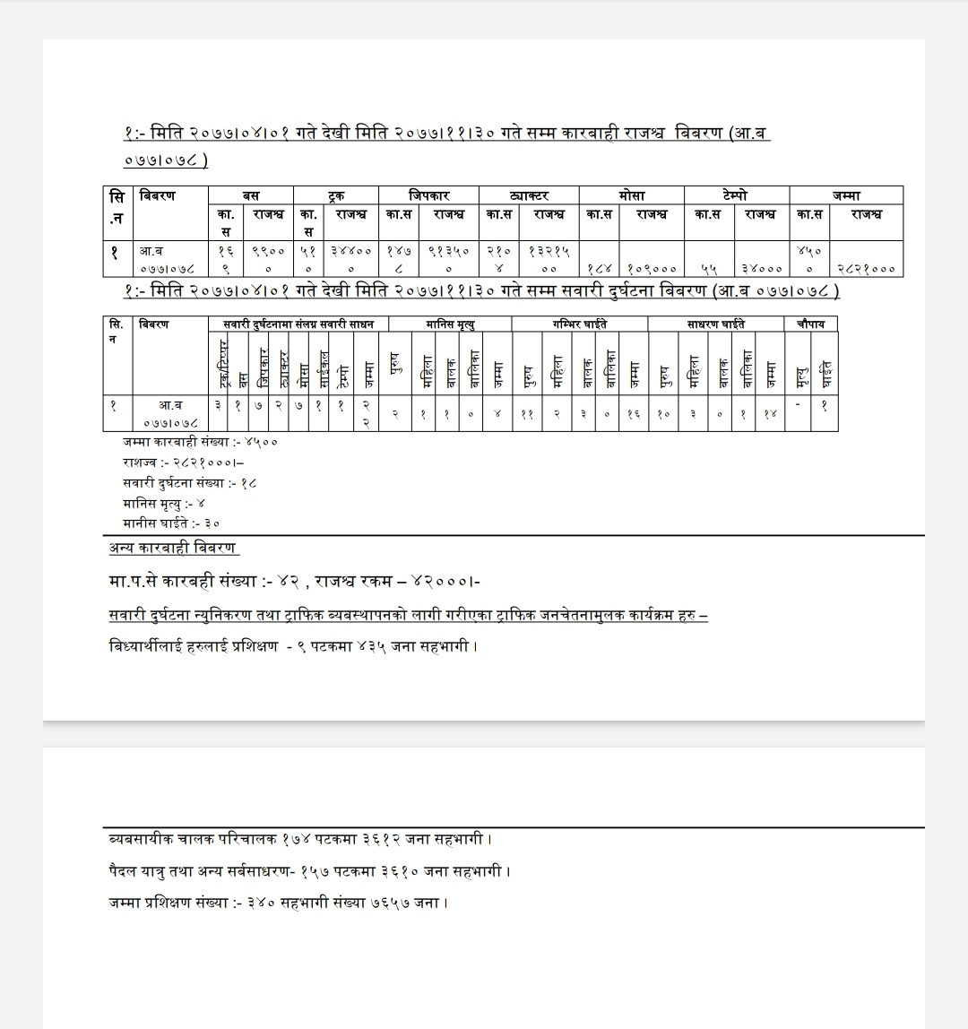 यस अवधिमा जिल्लामा १८ वटा सवारी दुर्घटनामा ४ जनाले ज्यान गुमाएका छन भने, ३० जना घाईते भएको कार्यालयले जनाएको छ । मालवाहक सवारी साधनले क्षमताभन्दा बढी समान बोक्ने, जिप कारले क्षमताभन्दा बढी यात्रु राख्ने, लाइसेन्स नबोक्ने र जथाभावी पार्किङ गर्ने सवारी धनिहरुलाई कारबाही गरीएको कार्यालयका प्रहरी हवल्दार नारायण पराजुली बताए । उनका अनुसार मोटरसाइकल चालकले लाइसेन्स बिना र मदिरा सेवन गरी मोटरसाईकल चलाउँदा कारबाहीमा पर्ने गरेको बताए ।