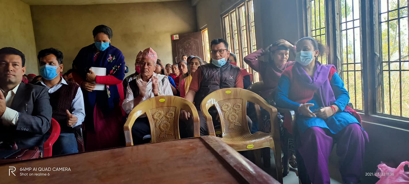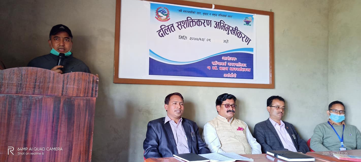 कार्यक्रममा नगरसभा सदस्य लक्ष्मण पराजुलीले दलित सशक्तीकरण कार्यक्रमले दलित समुदायको हक अधिकार सुनिश्चित गर्ने उदेश्य ले चेतनामूलक कार्यक्रम सन्चालन गरिएको बताउनु भयो । कार्यक्रममा वार्ड सचिब पुस्पा भुसाल कुल बहादुर नेपाली लगाएतको उपस्थिति रहेको थियोे ।