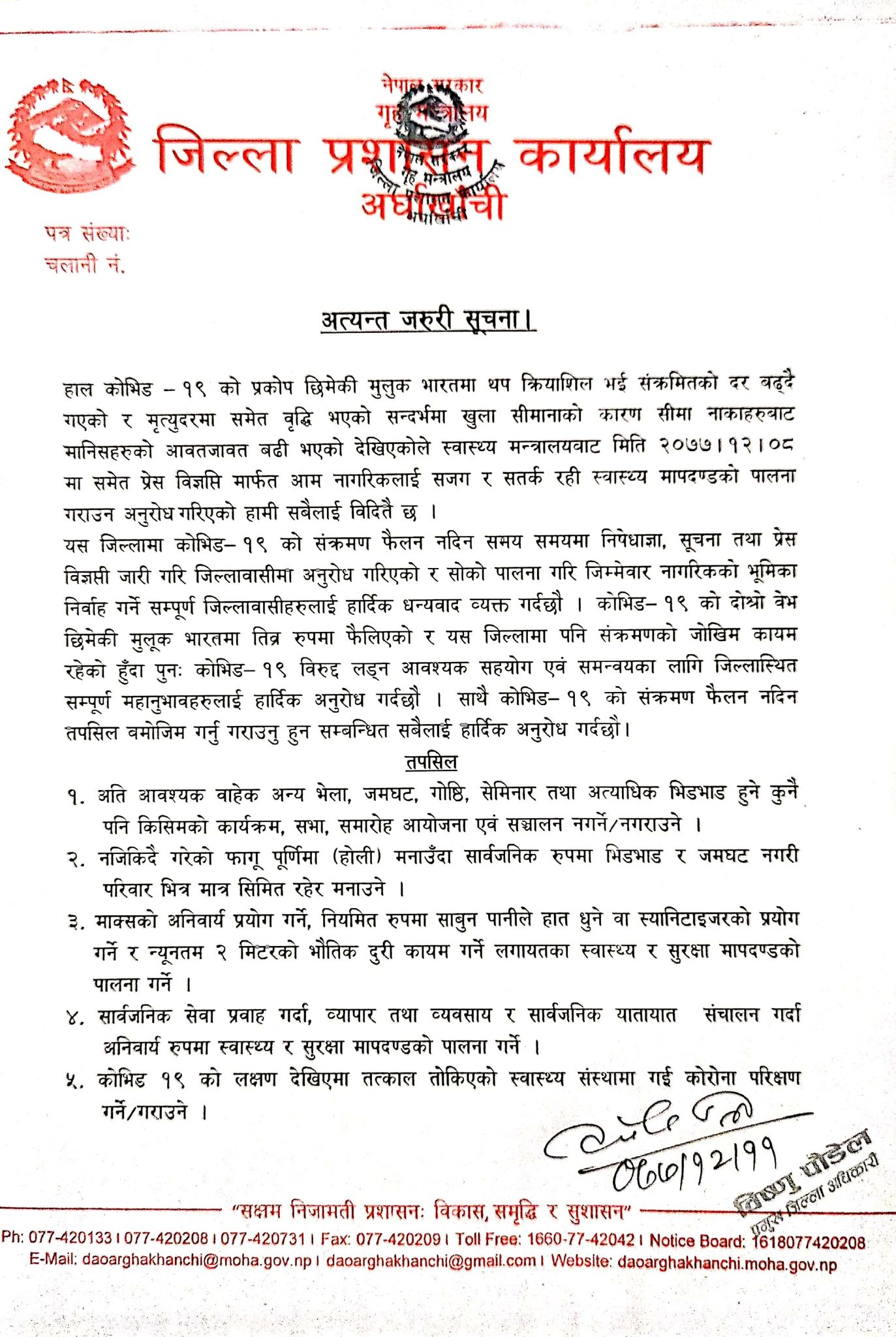 बुधबार अर्घाखाँचीका प्रमुख जिल्ला अधिकारी बिष्णु पौडेलको अध्यक्षतामा सम्पन्न कोभिड-१९ संकट ब्यवस्थापन केन्द्रको बैठकले जिल्लामा अत्याधिक भिड्भाड हुने सभा समारोह आयोजना गर्न रोक लगाउँने निर्णय गरेको हो ।