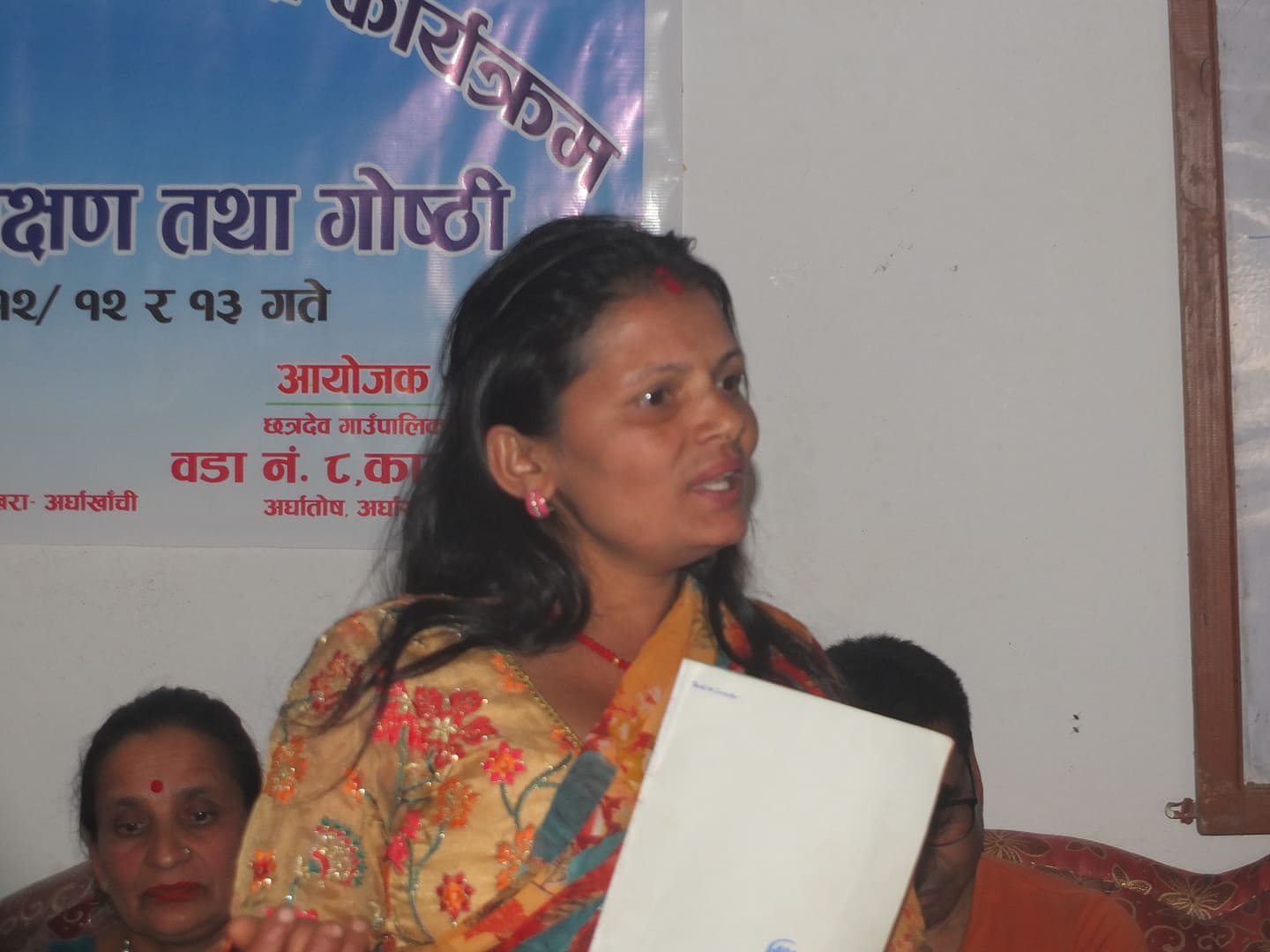 त्यस्तै कार्यक्रममा बाेल्दै छत्रदेव गाउँपालिका वडा न. ८ का वडा अध्यक्ष राजकुमार क्षेष्ठ ले तालिम बाट सिकेका कुरा लाई आफ्नाे व्यक्ति गत व्यबहारमा र समाजमा समेत कार्यान्वयन गर्न आग्रह गर्नुभयाे ।