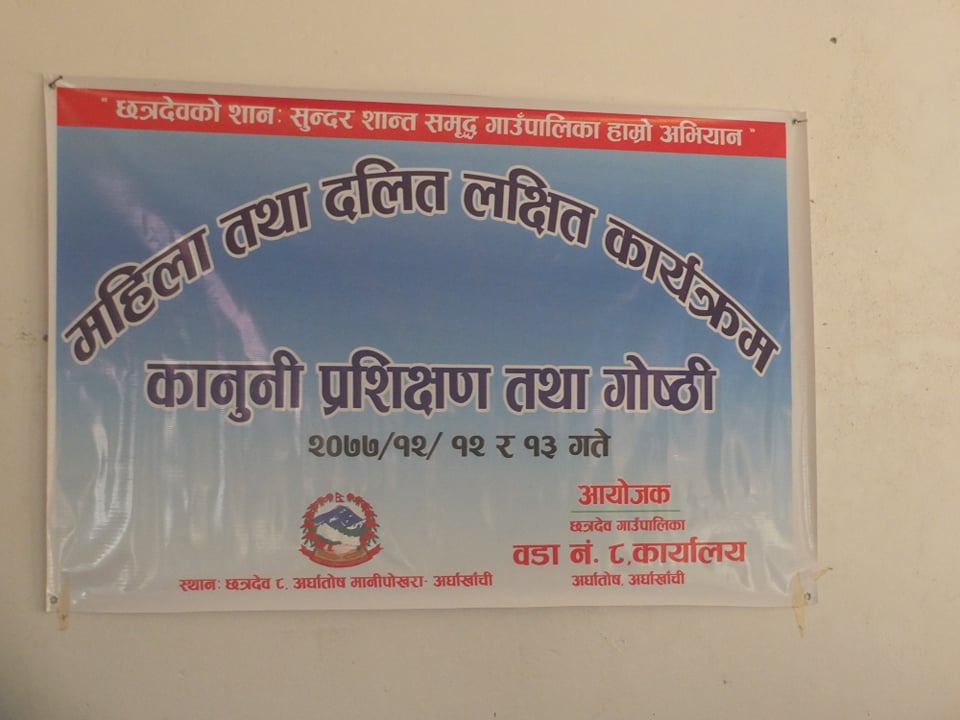 १२ र १३ गरि दुईदिन वडा भित्रका महिला तथा दलित समुदायका महिला लाई लक्षित गरि ६० जना महिलाहरुलाई कानुनी प्रशिक्षण तालिम प्रदान गरिएकाे वडा सचिव पुस्पराज भण्डारीले जानकारी दिनु भयाे।