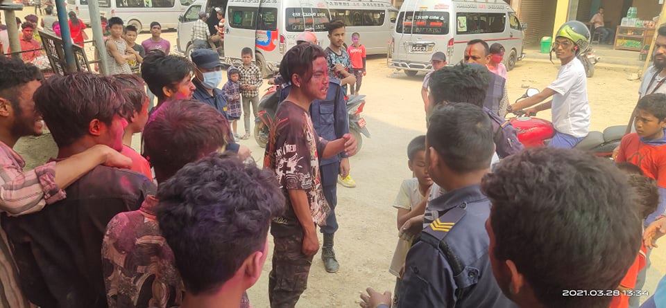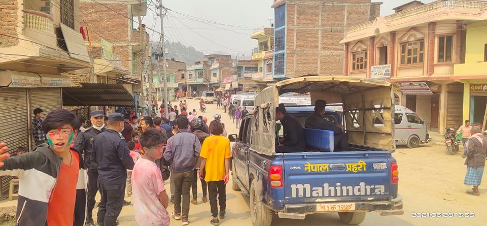 उता जिल्ला प्रशासन अर्घाखाँचीले पारिवारिक रुपमा सुरक्षित रहेर चाडपर्व मनाउन सचेत गराउदा गराउदै पनि जबर्जस्ती सदरमुकाम सन्धिखर्कका सडकमा युवाहरू होली खेलेका थिए ।