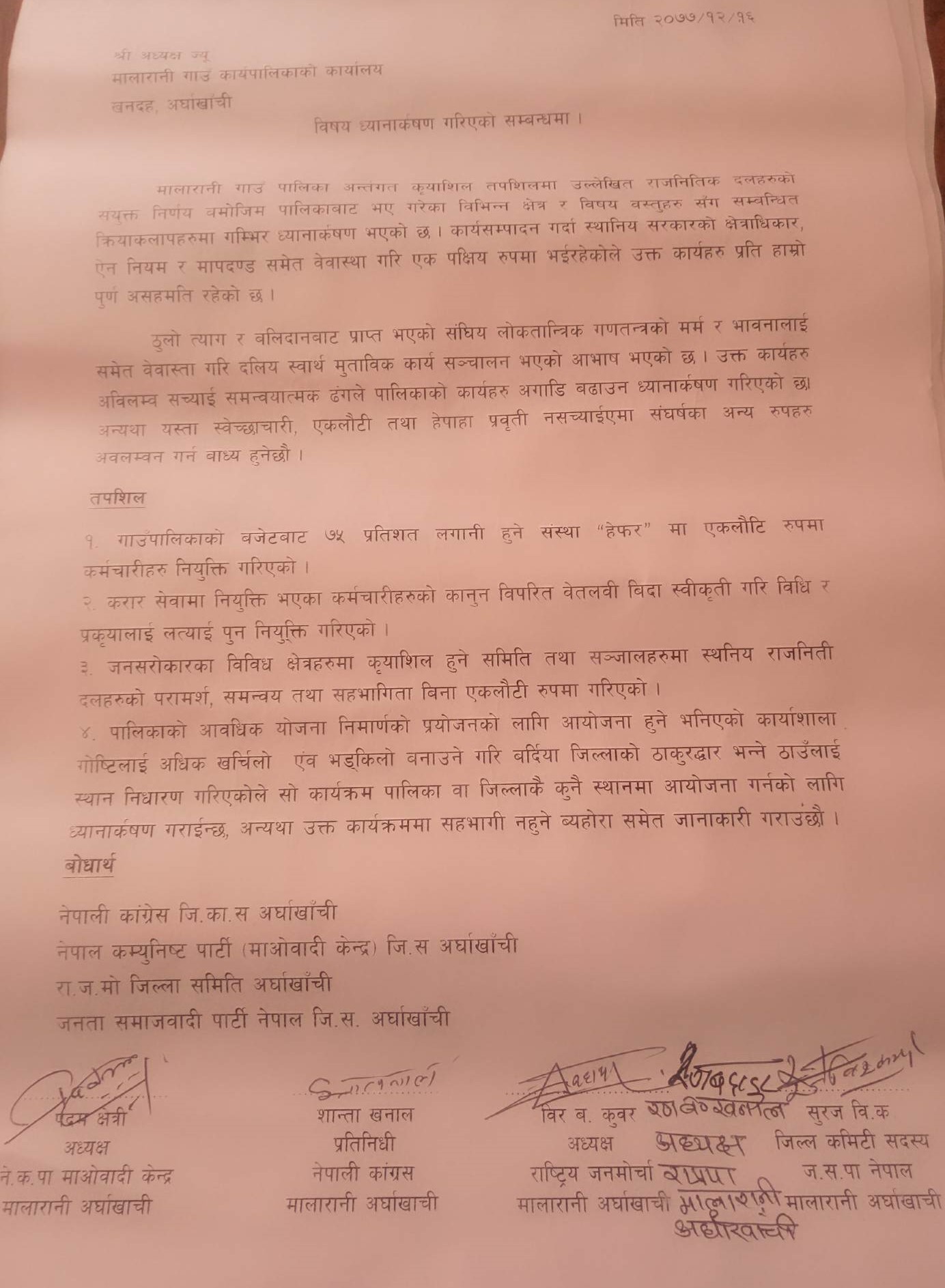 ५ राजनीतिक दलहरुले चार बुदे ध्यानाकर्षण पत्रमा एकलौटी कर्मचारी नियुक्त गरिएको विषय, नियम विपरित कर्मचारी नियुक्त, समिती र सञ्जालमा एकलौटी, जनताको पैसाले आवधिक भ्रमणका नाममा खर्चिलो कार्य गर्न लागेको आरोप लगाउँदै पालिकाका ध्यानाकर्षण पत्र बुझाएका हुन् ।