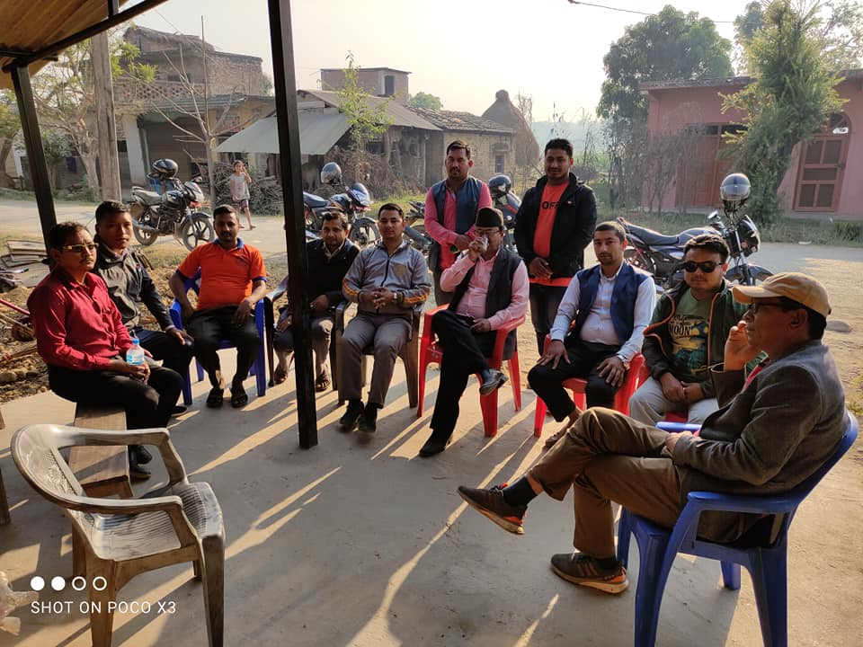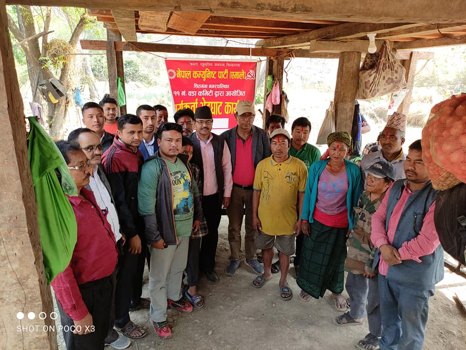 पार्टीको ११ न. वार्ड कमिटी अध्यक्ष तथा जिल्ला अधिवेशन आयाेजक कमिटी सदस्य कमरेड नवराज भुसालकाे संयोजकत्वमा वडाकाे माैवाबारी, लुङ्ग्री, खयरभट्टि र बेलखाेलामा आयाेजित भेटघाट कार्यक्रममा वार्ड कमिटी ईन्चार्ज तथा जिल्ला अधिवेशन आयाेजक कमिटी सदस्य नारायण प्रसाद आचार्य ,११न. वार्ड सदस्य ईन्द्र ब.पल्ली ,जिल्ला अधिवेशन आयाेजक कमिटी सदस्य गाेपाल खनाल , देवेन्द्र रेस्मी, वाेम ब. बि क , बुध्दि ब.नेपाली र माैवाबारी लुङ्ग्रि टाेल कमिटी संयोजक दिपक नेपाली र युवा संघ शितगंगा नगर कमिटी सदस्य रेशम नेपाली लगायतका थुप्रै नेता तथा कार्यकर्ताहरुकाे सहभागिता रहेकाे थियाे ।