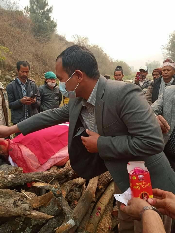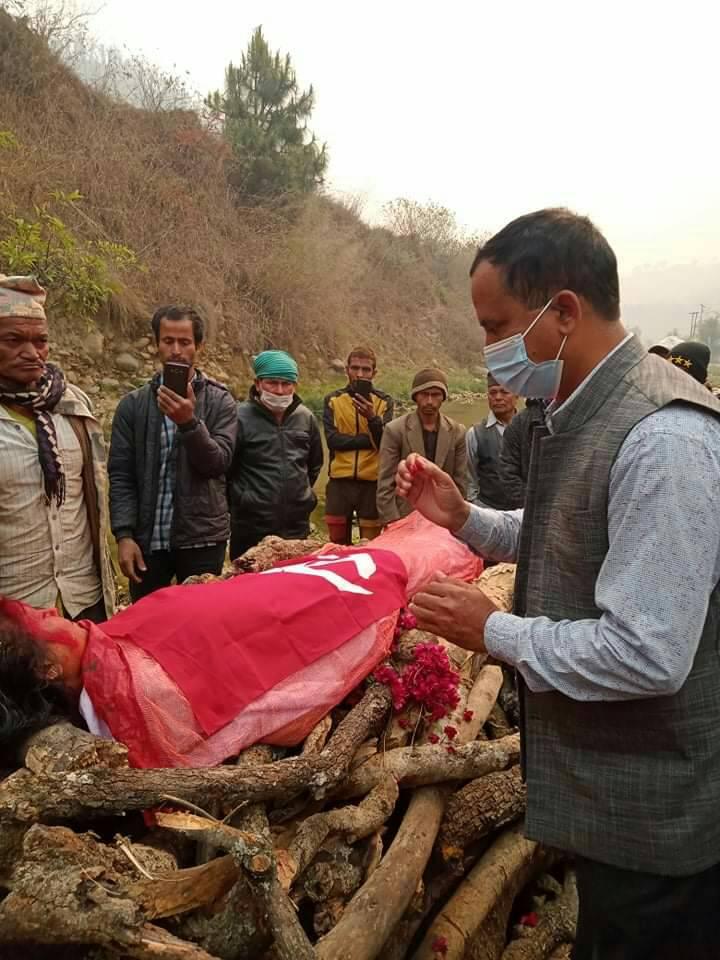 मृतकको पार्थिव शरीरमा नेकपा एमालेका केन्द्रीय सदस्य राष्ट्रिय सभा सदस्य चन्द्र वहादुर खड्काले पार्टीको झण्डा ओडाएर अवीर तथा पुष्पगुच्छा अर्पण गरी अन्तिम श्रद्धाञ्जली ब्यक्त गर्नु भयो ।