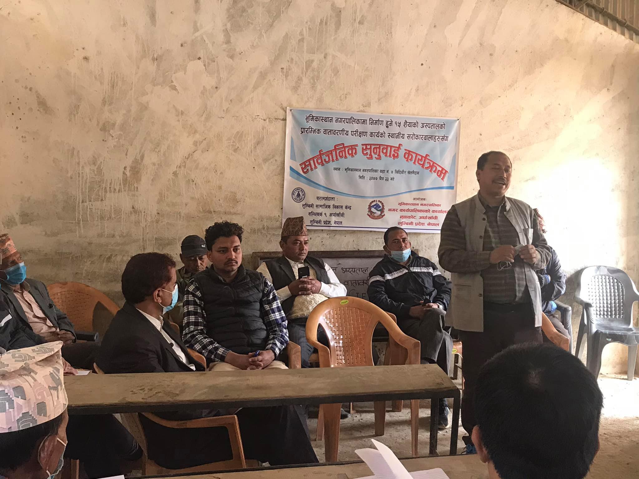 नुवाकोट, अर्घाखाँची (अर्घाखाँचीडट्कम) । अर्घाखाँची जिल्लाकाे भुमिकास्थान नगरपालिकामा निर्माण हुने १५ शैयाको अस्पतालको प्रारम्भिक वातावरणिय परिक्षण कार्यको स्थानिय सरोकारवालाहरुसँग सार्वजनिक सुनुवाई कार्यक्रम सम्पन्न भएको छ ।