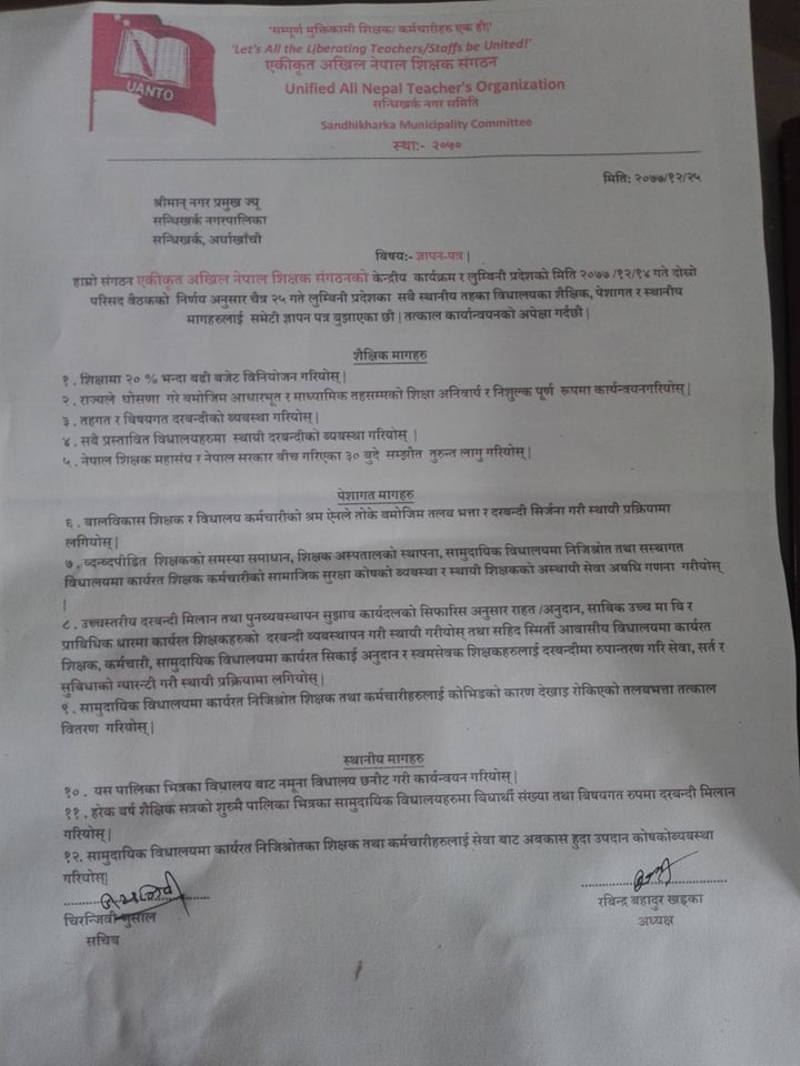 सन्धिखर्क, अर्घाखाँची (अर्घाखाँचीडट्कम) । अर्घाखाँची जिल्लाका सबै पालिकामा नेकपा (माओवादी केन्द्र) निकट एकीकृत अखिल नेपाल शिक्षक संगठनले विभिन्न माग राख्दै ज्ञापनपत्र बुझाएको छ ।