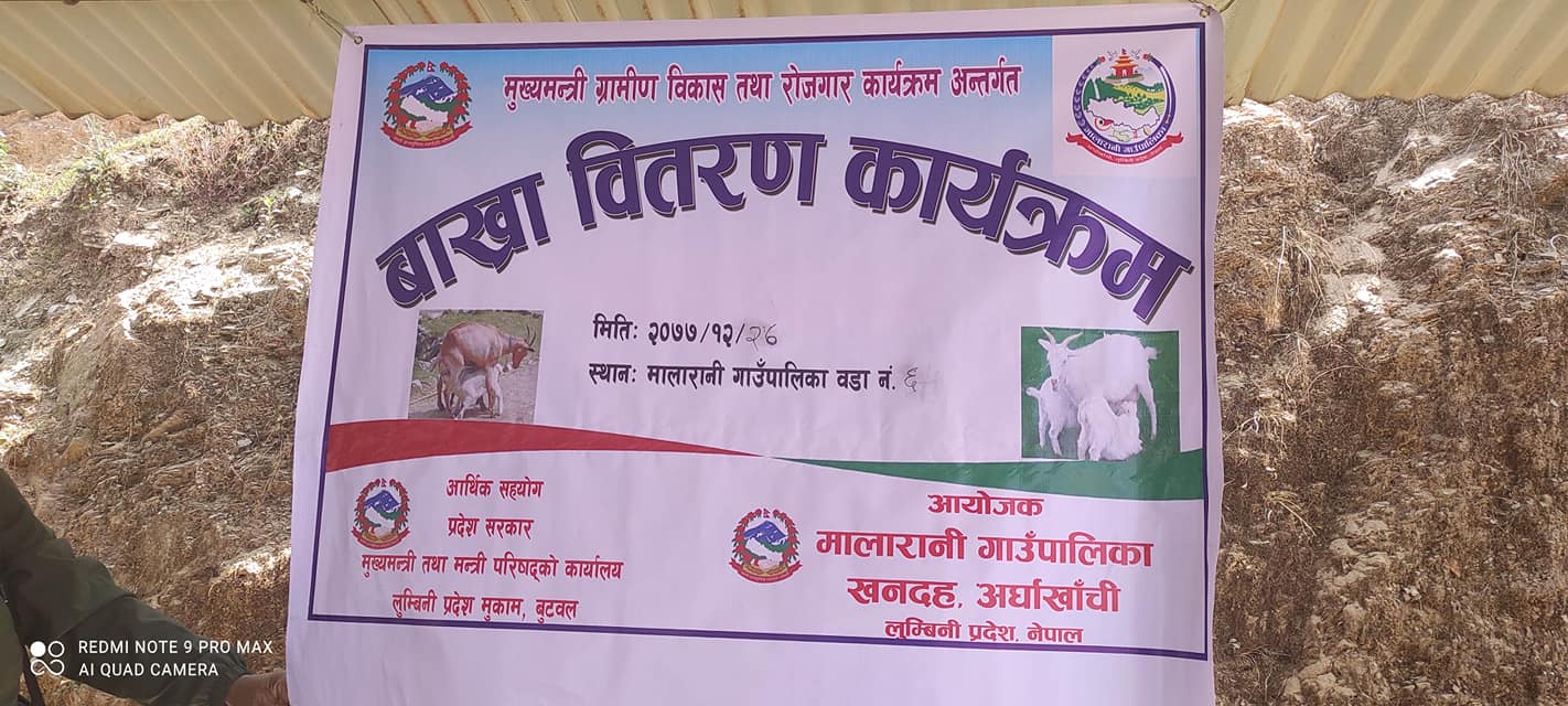 हंसपुर, अर्घाखाँची (अर्घाखाँचीडट्कम) । अर्घाखाँची जिल्लाको मालारानी गाउँपालिका वार्ड नम्बर ६ र ७ हंसपुरमा बिपन्न वर्गलाई आय आर्जनका लागि बाख्रा बितरण कार्यक्रम सम्पन्न भएको छ ।