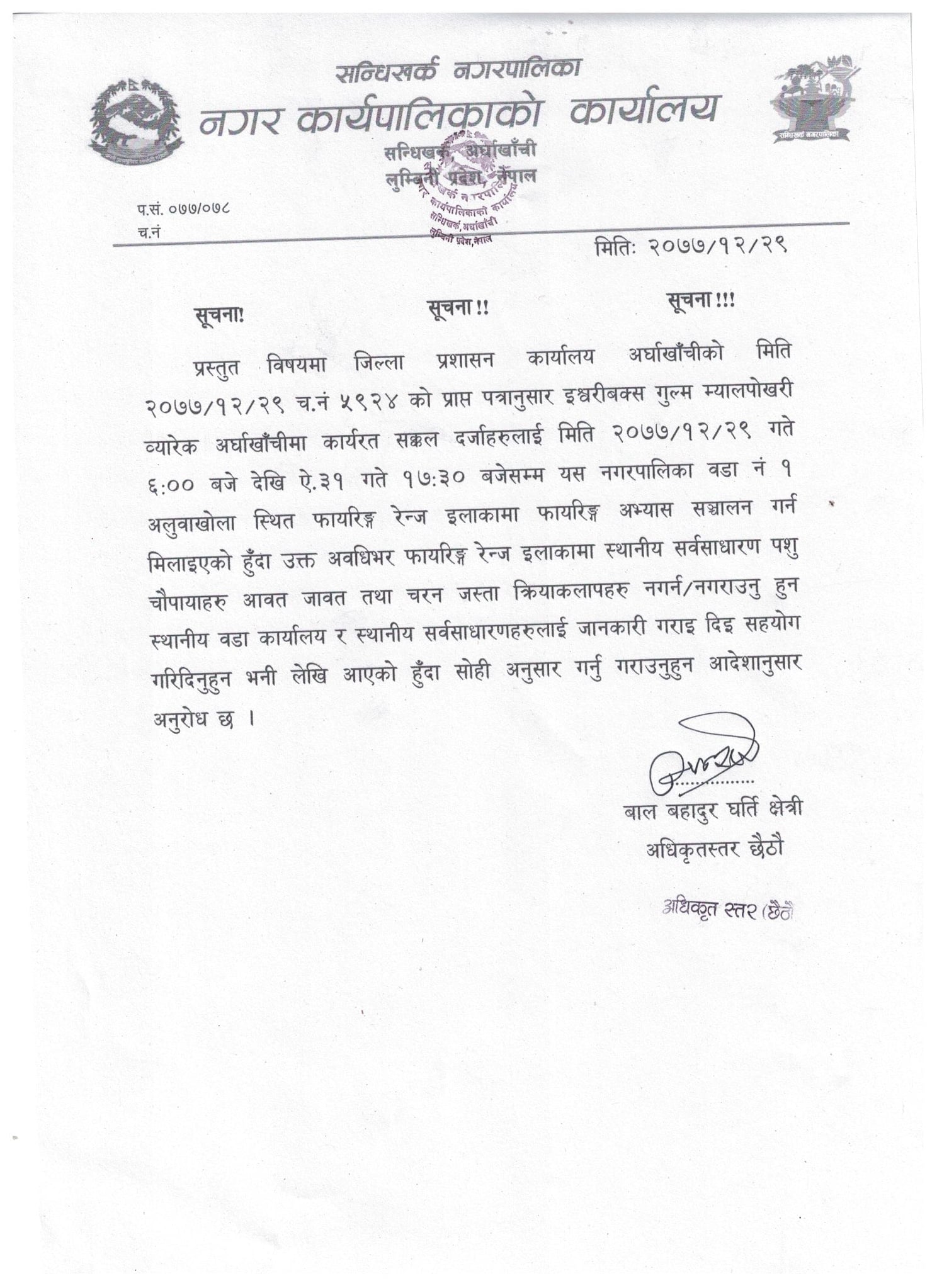 सन्धिखर्कको आटिकापाटा फुदवाङ बीचमा पर्ने अलुवाखोलामा ईश्वरीबक्स गुल्मा म्यालपोखरी ब्यारेकमा कार्यरत सक्कल दर्जाहरुलाई चैत्र २९ गते साँझ ६ बजेदेखि चैत्र ३१ गते ५:३० बजेसम्म  फायरिङ्ग रेन्ज ईलाकामा फायरिङ्ग अभ्यास हुने भएकोले आवत- जावत बन्द गरिएको हो ।