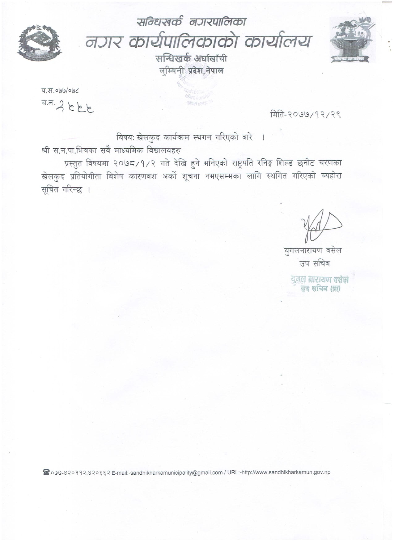 सन्धिखर्क नगरपालिकाले बैशाख २ गतेदेखि आयोजना गर्ने भनिएको राष्ट्रिय रनिङ सिल्ड छनौट चरणका खेलकुद प्रतियोगिता नहुने भएको हो ।