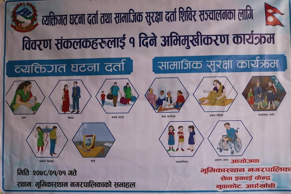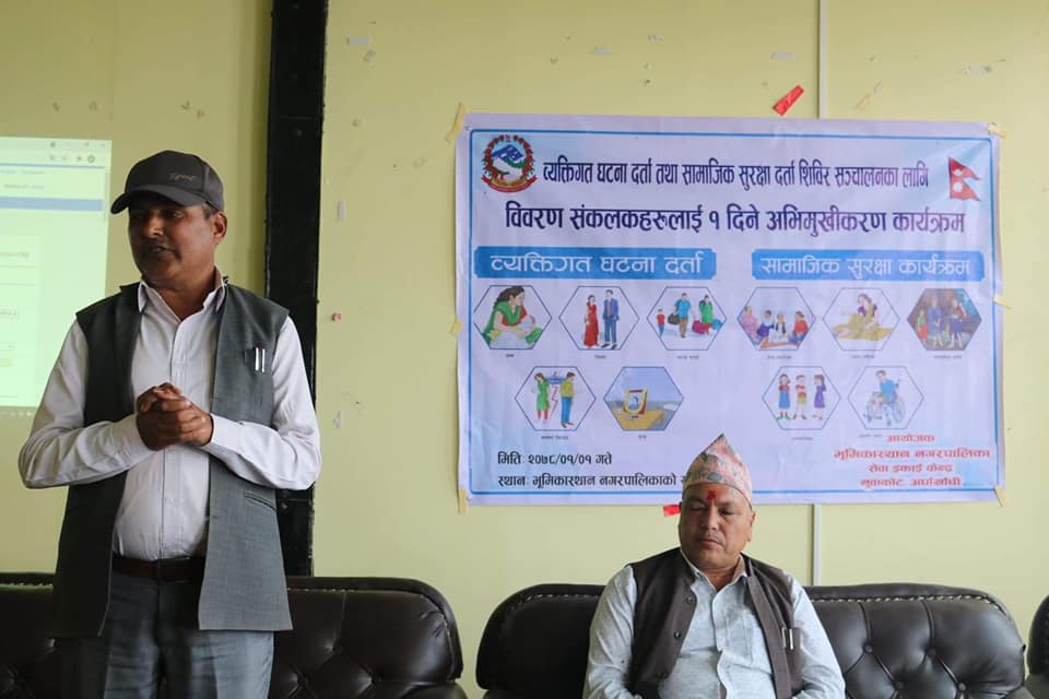 नुवाकोट, अर्घाखाँची (अर्घाखाँचीडट्कम) । अर्घाखाँची जिल्लाको भुमिकास्थान नगरपालिकाले व्यक्तिगत घटना दर्ता तथा सामाजिक सुरक्षा दर्ता शिविर संचालनका लागि विवरण संकलकहरुका लागि १ दिने अभिमुखिकरण कार्यक्रम सम्पन्न गरेकाे छ ।