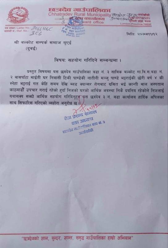 वलकोट निवासी ४ बर्षिय स्नेहालाई ब्लड क्यान्सर भएको हुदा हाल कान्ति वाल अस्पतालमा उपचार भई रहेको छ । परिबारको आर्थिक स्थिति कमज़ोर रहेको पुस्टीगर्दै छत्रदेव ३ वडा कार्यालय ले दिएको सिफ़ारिशको आधारमा सहयोगको अपील गरिएको अभियंता सिता भट्टराई ले वताउनु भयो । समाजका सचिव अमित पाण्डेले मानवीय सेवामा समर्पित हुदै आफ्नो खाजा खर्च कटाएर सहयोग संकलन गरिएको वताउदै यसको दुरुपयोग नगर्न आग्रह गर्नु भएको छ ।