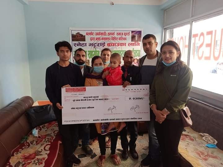 वलकोट निवासी ४ बर्षिय स्नेहालाई ब्लड क्यान्सर भएको हुदा हाल कान्ति वाल अस्पतालमा उपचार भई रहेको छ । परिबारको आर्थिक स्थिति कमज़ोर रहेको पुस्टीगर्दै छत्रदेव ३ वडा कार्यालय ले दिएको सिफ़ारिशको आधारमा सहयोगको अपील गरिएको अभियंता सिता भट्टराई ले वताउनु भयो । समाजका सचिव अमित पाण्डेले मानवीय सेवामा समर्पित हुदै आफ्नो खाजा खर्च कटाएर सहयोग संकलन गरिएको वताउदै यसको दुरुपयोग नगर्न आग्रह गर्नु भएको छ ।