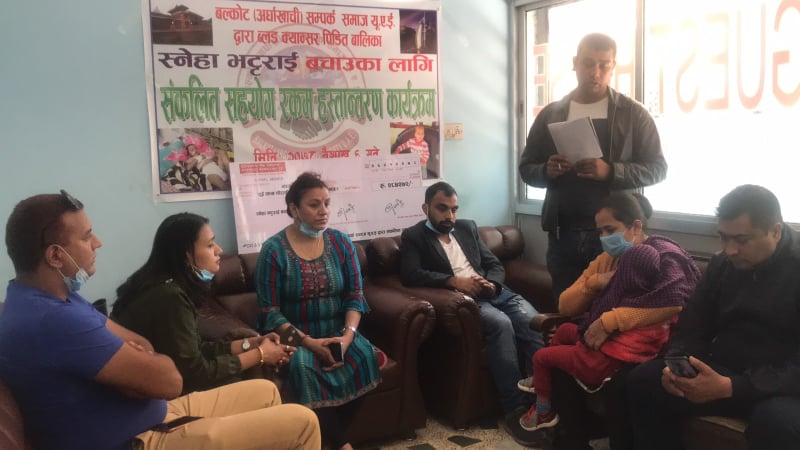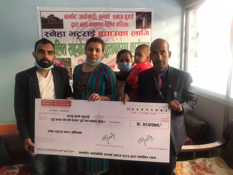 चार वर्षीय स्नेहा भट्टराई बचाउका लागि संकलन भएको रु २ लाख ८४ हजार २ सय ७२ रुपैया काठमांडौ स्थित एक होटलमा औपचारिक कार्यक्रम विच बल्कोट सम्पर्क समाज युएईका सचिव अमित पाण्डेय (प्रकाश),समाजसेवी सिता भट्टाराई र अर्घाखाँची डटकम् व्युरो प्रमुख डिआरजी सुमन मार्फत पिडित बालिका र आमाको हातमा चेक हस्तान्तरण भएको छ।