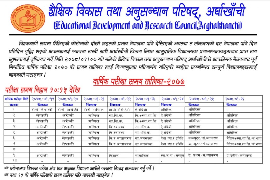 परिषदले कक्षा ८ को आधारभूत तह उत्तीर्ण परीक्षा बाहेक कक्षा १ देखि ९ सम्मको रुटिन समेत सार्वजनिक गरेको छ ।