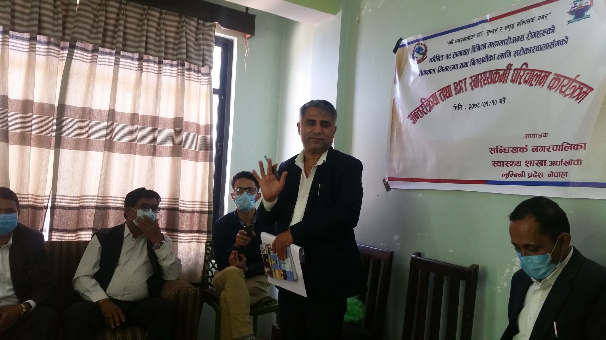 सन्धिखर्क, अर्घाखाँची  (अर्घाखाँचीडट्कम) । अर्घाखाँची जिल्लाको सन्धिखर्क नगरपालिकामा कोरोना लगायत विभिन्न महामारी जन्य रोगहरुको रोकथाम, नियन्त्रण तथा निगरानीका लागि सरोकारवाला संगको अन्तरक्रिया तथा आरआरटी स्वास्थयकर्मी परिचालन कार्यक्रम आज सम्पन्न भएको छ ।