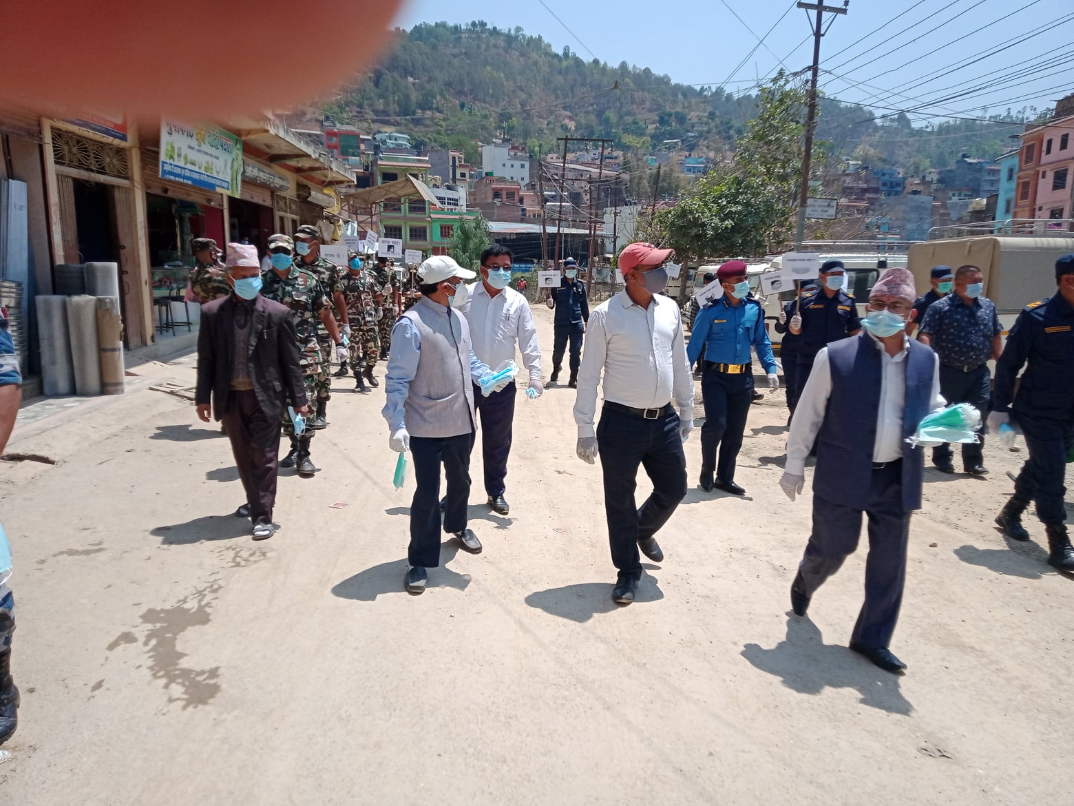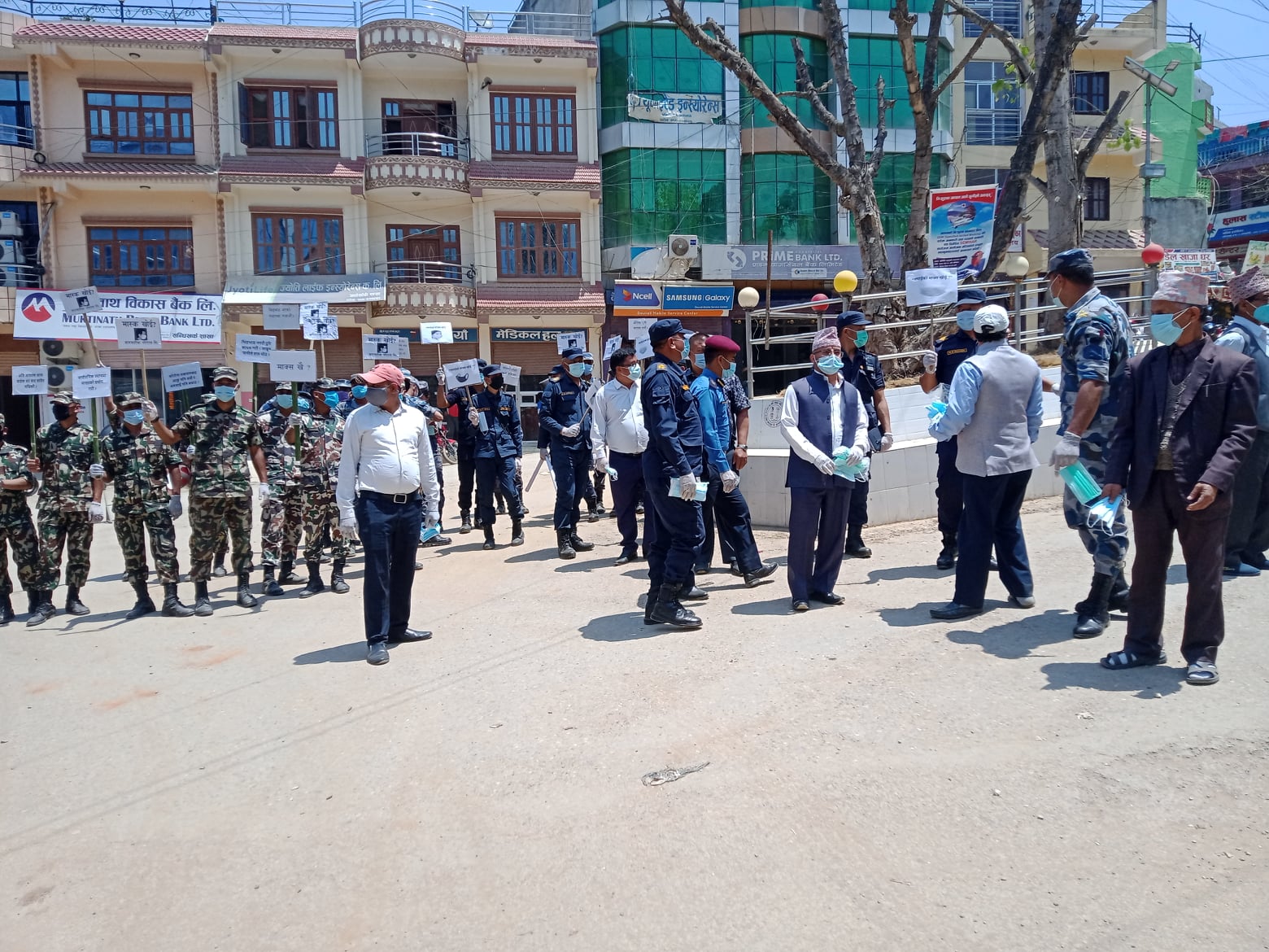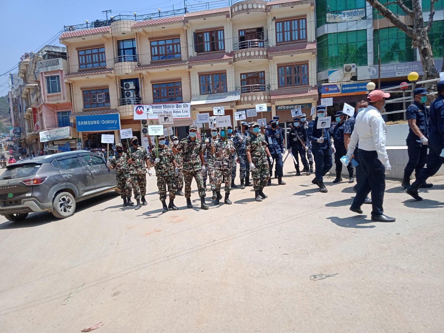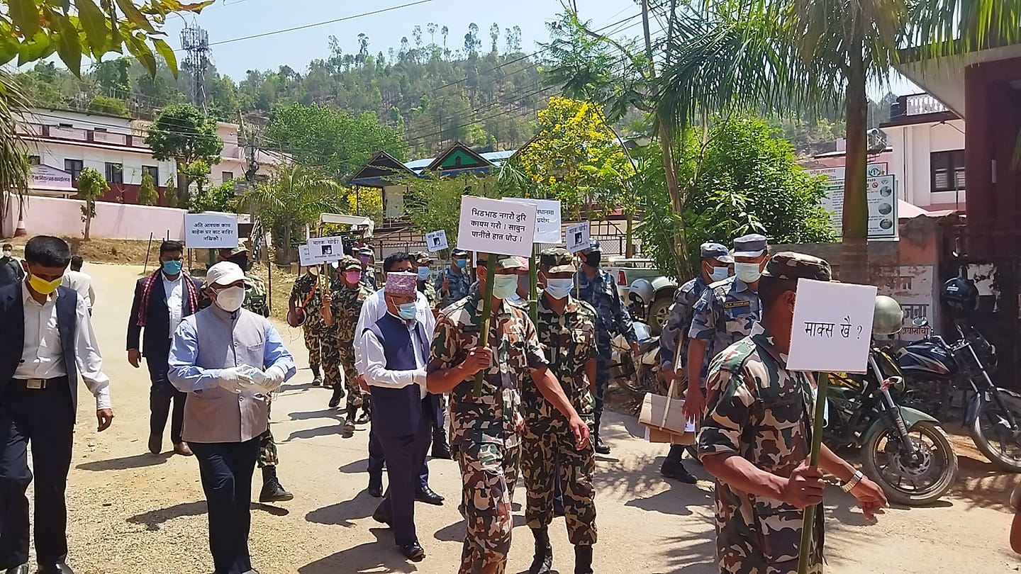 प्लेकार्ड सहित सन्धिखर्कका सडकमा प्रमुख जिल्ला अधिकारी बिष्णु पौडेल सहितको सुरक्षा टोलीले आईतबार जनचेतना जगाउँदै मास्क नलगाएकाहरुलाई मास्क उपलव्ध गराएको हो ।