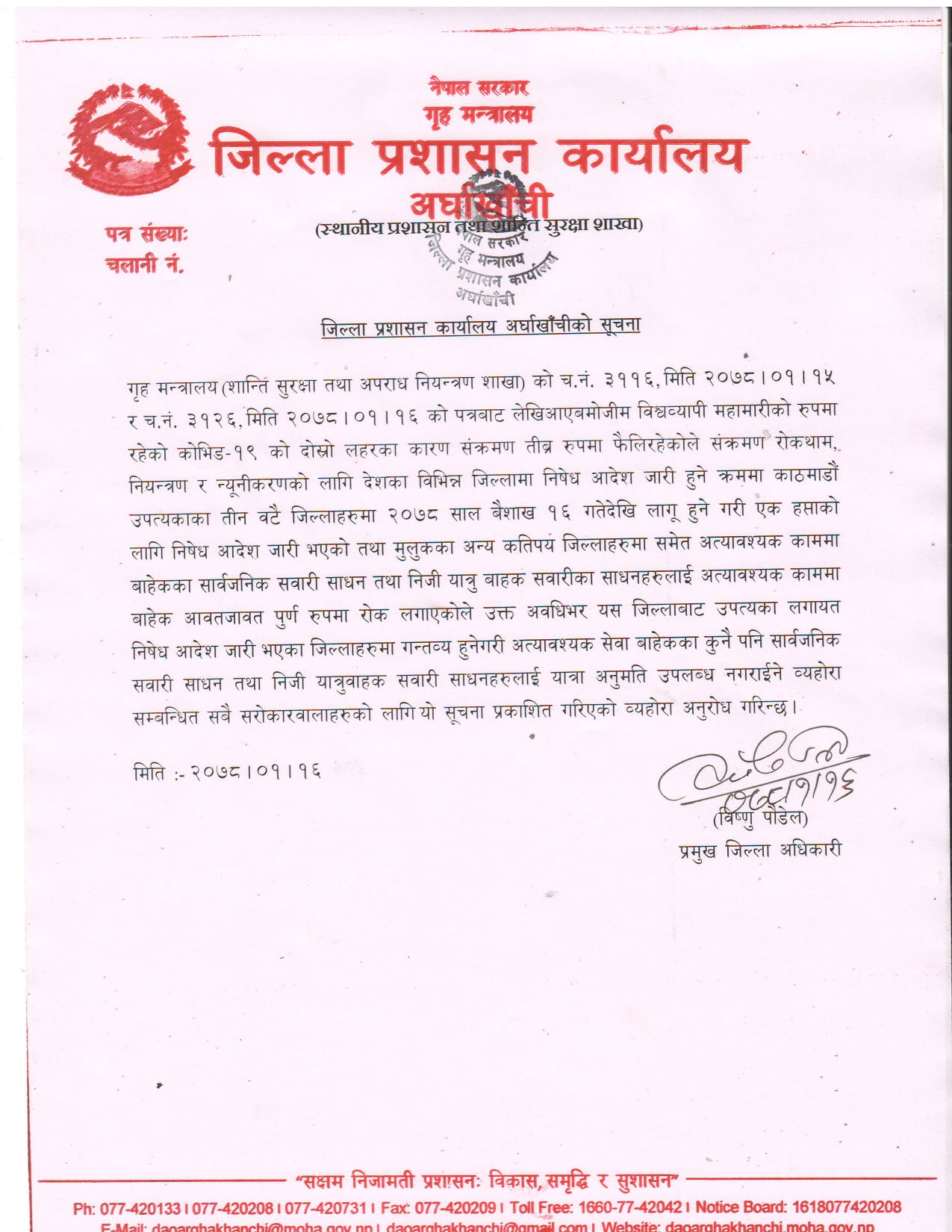 जिल्ला प्रशासन कार्यालय कार्यालयले एक सुचना जारी गर्दै जिल्लाबाट निषेधाज्ञा जारी भएका रुपन्देही, काठमाडौंमा आवतजावत गर्ने सार्वजनिक तथा निजी सवारीसाधन माथि रोक लगाइएको हो ।