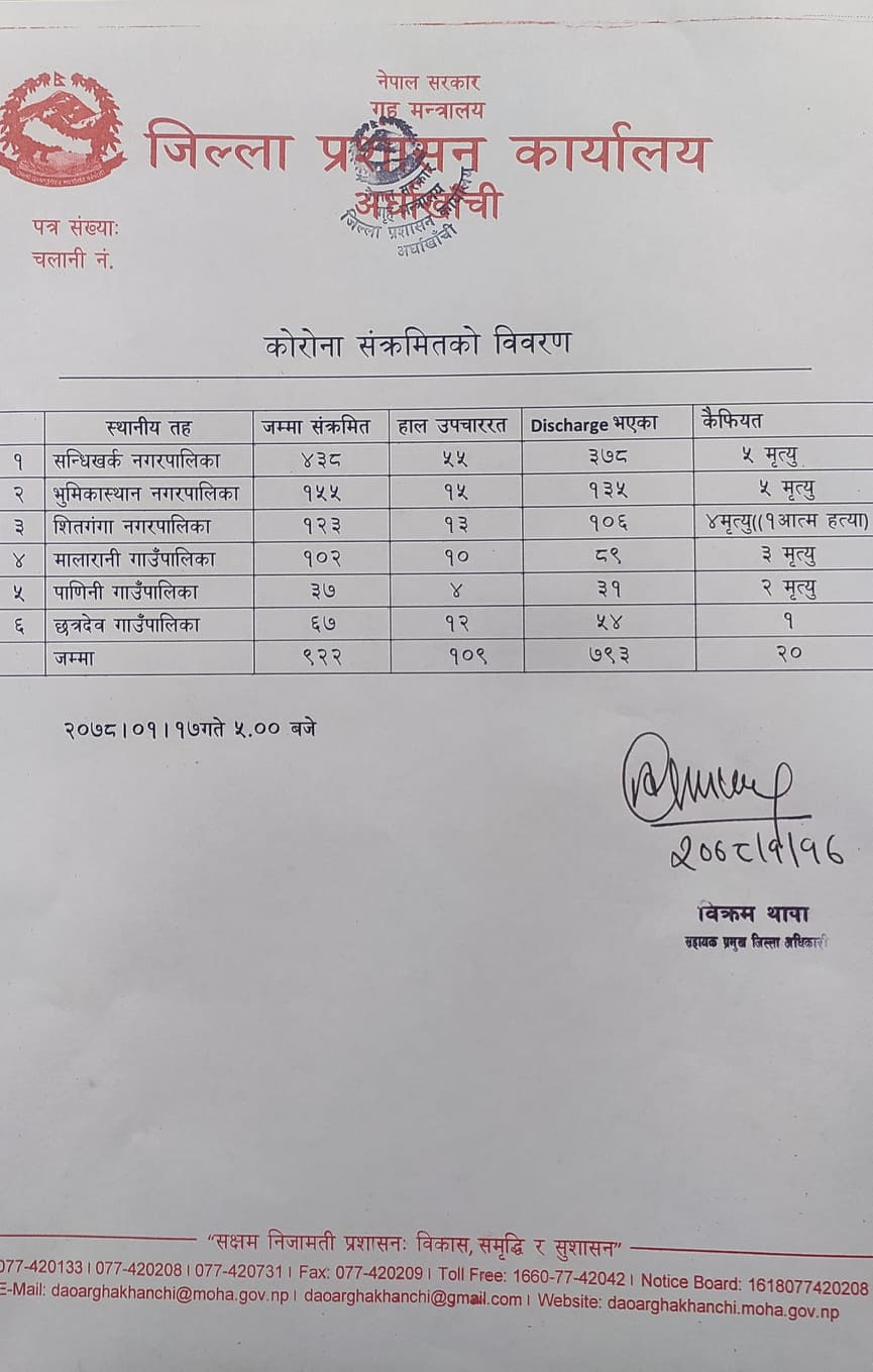 सन्धिखर्क, अर्घाखाँची (अर्घाखाँचीडट्कम) । अर्घाखाँची जिल्लामा आजसम्म सक्रिय कोरोना संक्रमितको संख्या १०९  जना पुगेको छ ।