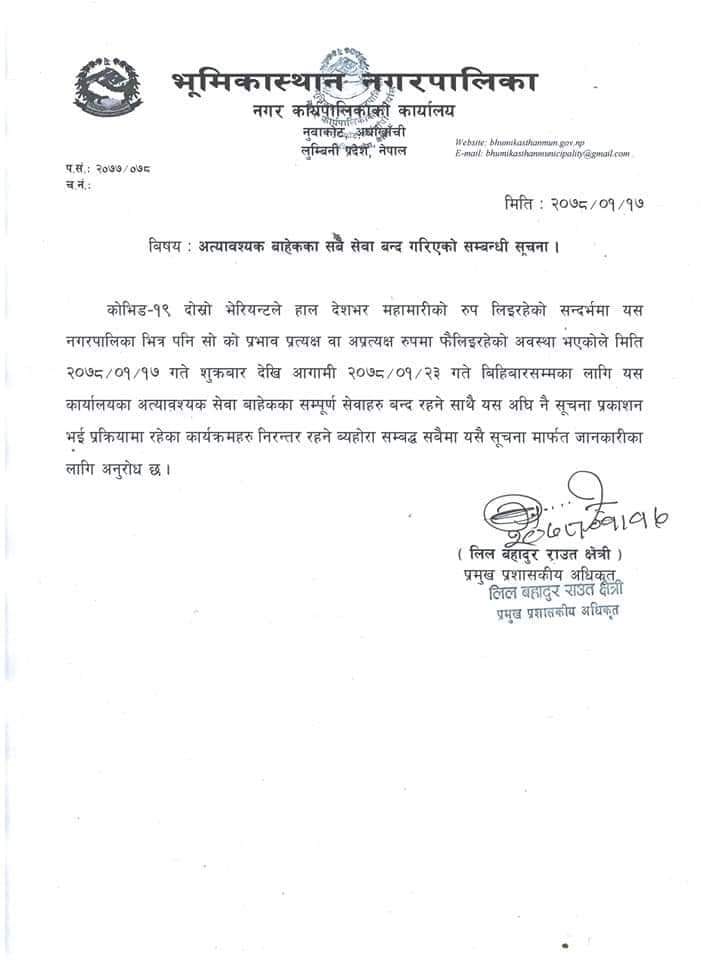 नुवाकोट, अर्घाखाँची (अर्घाखाँचीडट्कम) । अर्घाखाँची जिल्लाको भूमिकाथान नगरपालिकाले कोरोना संक्रमण बढेको भन्दै अत्यावश्यक काम बाहेकका सबै सेवा वैशाख २३ गते सम्मका लागी बन्द गरेको छ ।