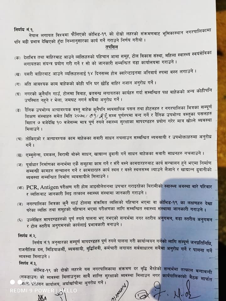 नगरपालिकामा आईतबार बसेको बैठकले कोरोना भाइरस संक्रमण तीव्र रूपमा बढेपछि रोकथामका लागि भन्दै यहाँ यातायात, व्यवसाय, अत्यावश्यक सेवाबाहेकका सबै क्षेत्र बन्द गर्ने भएको छ ।