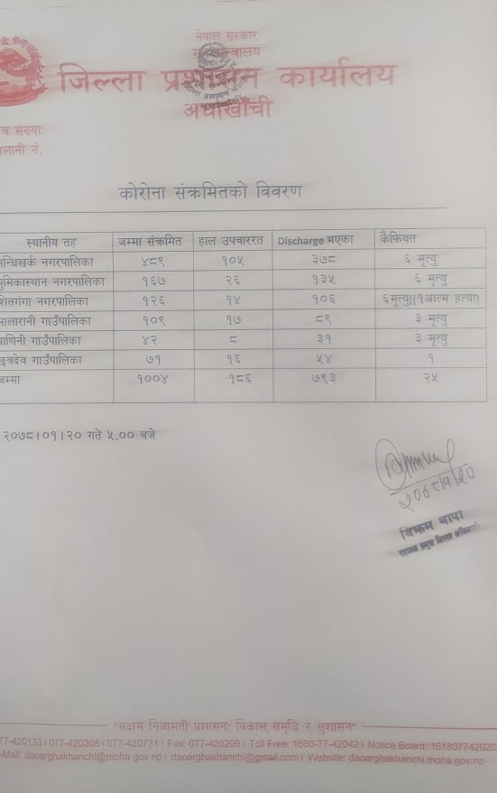 सन्धिखर्क, अर्घाखाँची (अर्घाखाँचीडट्कम) । अर्घाखाँची जिल्लामा आजसम्म सक्रिय कोरोना संक्रमितको संख्या १८६ जना पुगेको छ ।