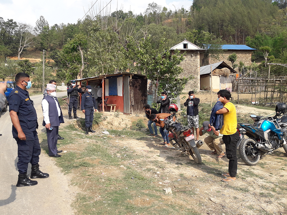 सोही अनुगमनको क्रममा पालिकाको वार्ड न. २ बल्कोटमा पर्ने मथुराबेसीको एक होटलमा निषेधाज्ञा उल्लंघन गरिरहेको गतिविधिमा संलङ्न केही युबा तथा होटेल सन्चालकलाई उठबस गराइएको थियो । साथै उनीहरुले प्रयोग गरेका मोटरसाइकलको चाबी समेत जफत गरिएको थियो।