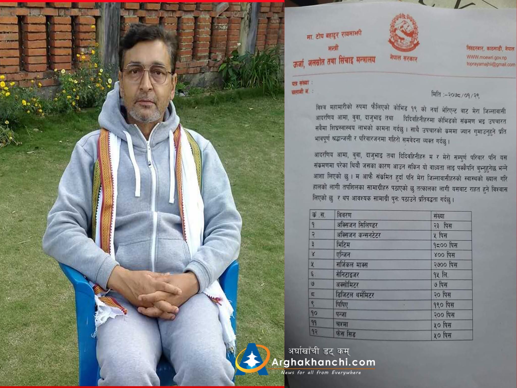 उर्जा मन्त्री टोपबहादुर रायमाझीले अर्घाखाँचीलाई अक्सिजन सिलिण्डरसहित स्वास्थ्य सामाग्रीहरु पठाए