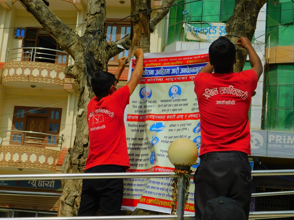 सन्धिखर्क, अर्घाखाँची । नेपाल कम्युनिस्ट पार्टी ( विप्लव) निकट अखिल क्रान्तिकारी लुम्बिनी ब्युरोको समन्वयमा अर्घाखाँची जिल्लामा कोरोना भाइरसबाट बच्ने र बचाउने जनसचेतना मुलुक कार्यक्रम गरेका छन्।