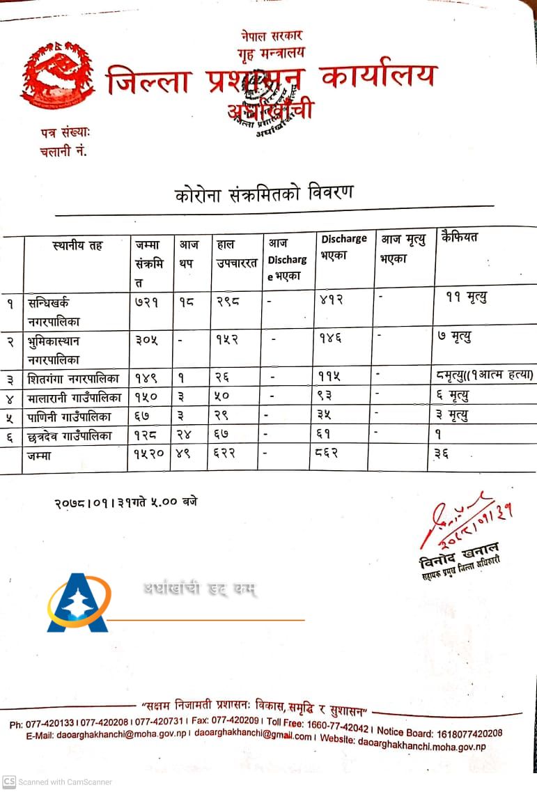 सन्धिखर्क, अर्घाखाँची (अर्घाखाँचीडट्कम) । अर्घाखाँची जिल्लामा पछिल्लो २४ घण्टामा थप ४९ जनामा कोरोना संक्रमित थपिएका छन् ।