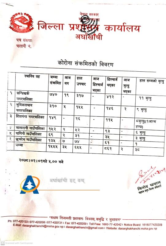 ठाडा, अर्घाखाँची (अर्घाखाँचीडट्कम) । अर्घाखाँची जिल्लामा सबैभन्दा कम सक्रिय कोरोना संक्रमित शितगंगा नगरपालिकामा रहेको छ । यहाँ पछिल्लो २४ घण्टामा नयाँ संक्रमित थपिएका छैनन्  ।