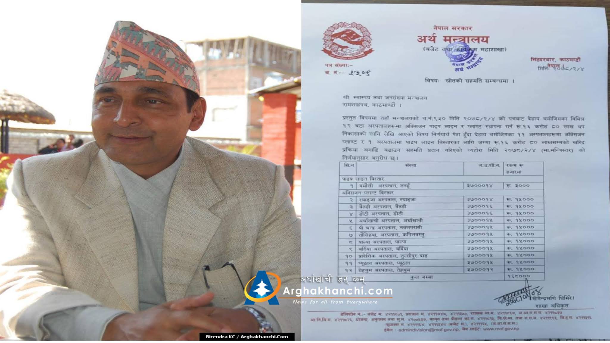 निजी सचीव नारायण खत्रीले अर्घाखाँचीडट्कम जानकारी गराए अनुसार “अर्थ मन्त्रालयबाट उर्जा जलस्रोत तथा सिंचाइ मन्त्रालयबाट बिकास तर्फ बिभिन्न याेजनामा बजेट बिनियाेजन गरिएको र अस्पतालमा अक्सिजन प्लान्ट तथा अन्य पुर्वाधार निर्माणमा प्रयाप्त रकम विनियोजन भएको हो ।” छिटोभन्दा छिटो जडान गरि सन्चालन हुनेछ – अर्घाखाँचीलाई प्रयाप्त अक्सिजन हुनेछ, उनले बताए ।