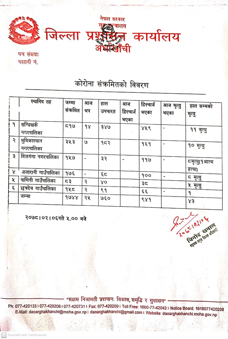 सन्धिखर्क, अर्घाखाँची (अर्घाखाँचीडट्कम ) । अर्घाखाँची जिल्लाको सन्धिखर्क नगरपालिका वार्ड नम्बर १ का एक युवाको कोरोना संक्रमणको कारण निधन भएको छ ।