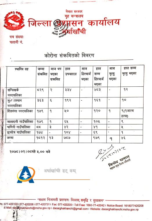 ठाडा, अर्घाखाँची (अर्घाखाँचीडट्कम ) । अर्घाखाँची जिल्लाको शितगंगा नगरपालिका वार्ड नम्बर ४ ठाडाका एक पुरुषको कोरोना संक्रमणको कारण निधन भएको छ ।