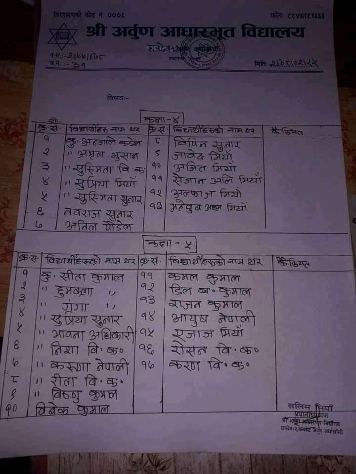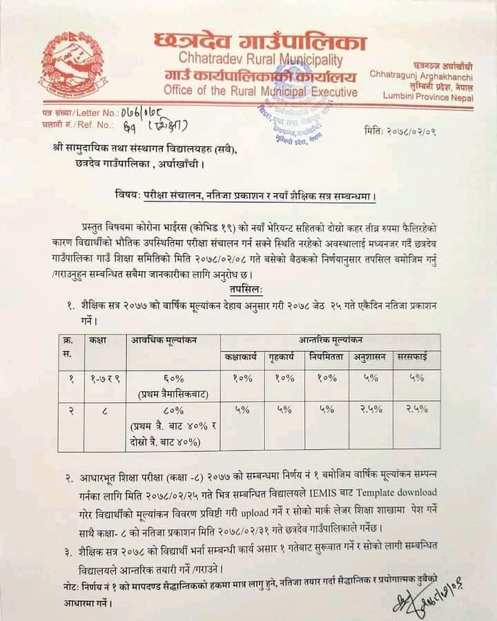 भौतिक उपस्थित, परीक्षा र प्रबिधिको प्रयोगबाट परीक्षा गर्न असम्भव भएकोले र असारबाट नया शैक्षिक सत्र समेत सुरु गर्नुपर्ने भएकोले प्रथम र दोस्रो त्रैमासिक परिक्षा को नतिजा आबधिक मुल्यांकन र विद्यार्थीको आन्तरिक मुल्यांकनलाई आधार मानी नतिजा प्रकाशन गरिएको हो ।