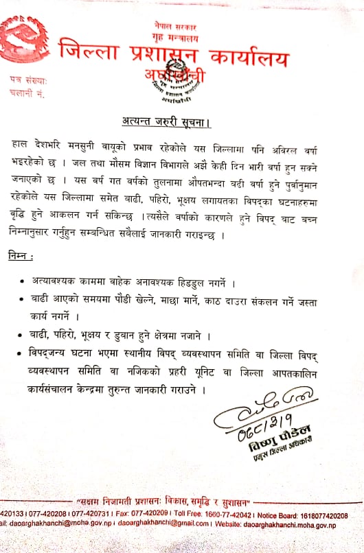 प्रमुख जिल्ला अधिकारी बिष्णु पौडेल मंगलवार जारी गरेको सुचना अनुसार लगातार परेको अविरल वर्षाका कारण बाढी, पहिरो जान सक्ने भन्दै सम्पूर्ण जिल्लाबासीहरुलाई उच्च सतर्कतामा रहन अनुरोध गरिएको हो ।