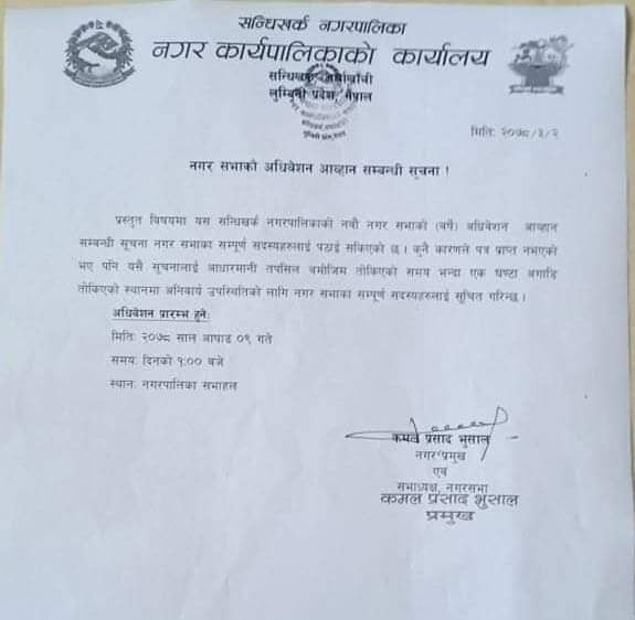 सन्धिखर्क नगरपालिकाकाे नवौ नगर सभाको अधिवेशन आगामी असार ९ गते दिउसो १ बजेदेखि नगरपालिका सभाहलमा हुने भएको हो ।
