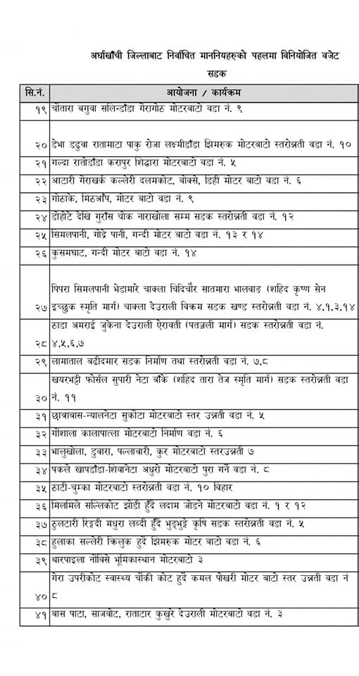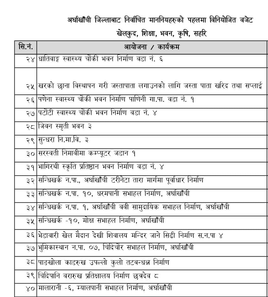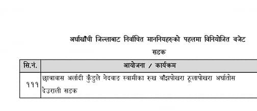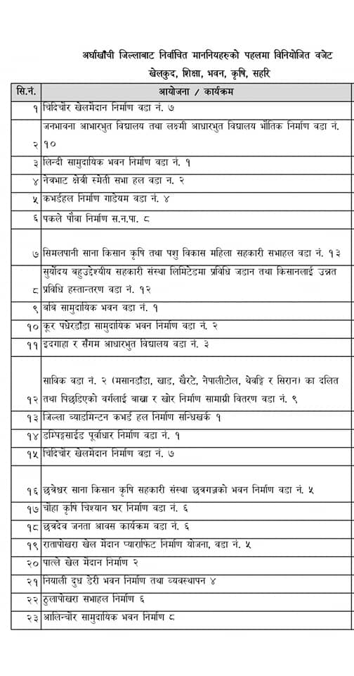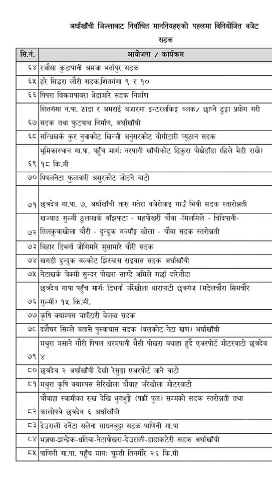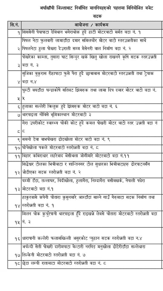 अर्घाखाँचीमा सडक तथा पुल, पर्यटन, कृषि, खेलकुद लगायतका क्षेत्रमा याेजनाहरु परे