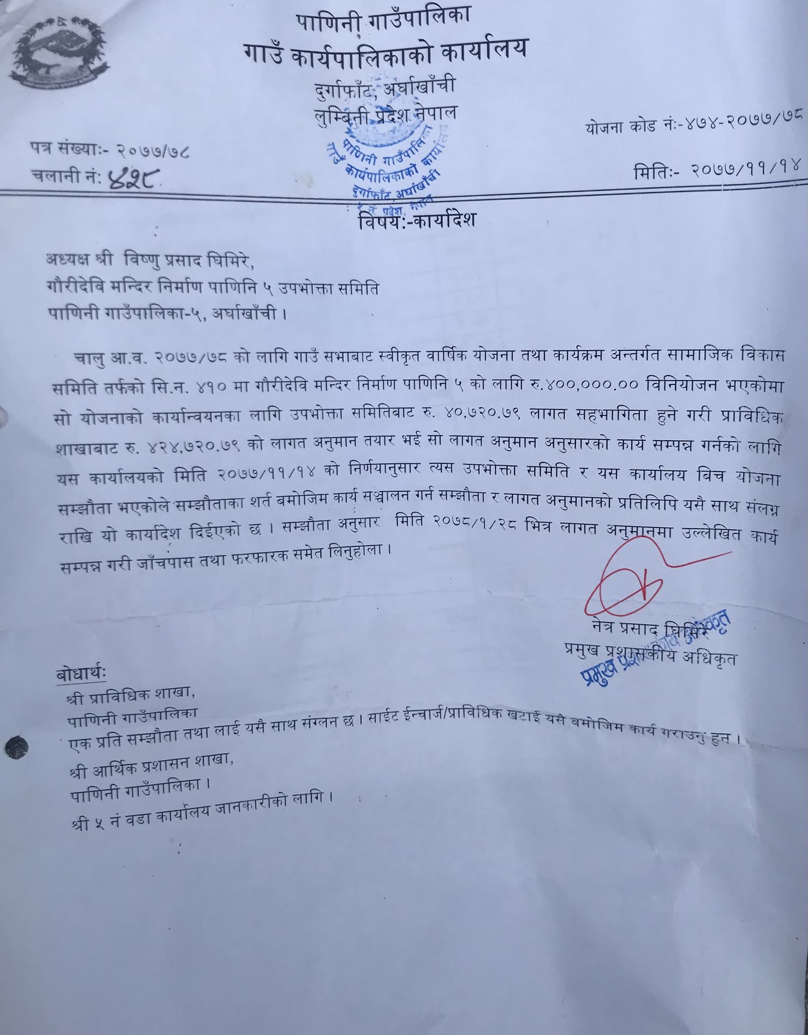 यसै क्रममा पाणिनी गाँउ पालिका को आर्थिक वर्ष २०७७/७८ को लागि गाउँ सभाबाट स्वीकृत वार्षिक योजना तथा कार्यक्रम अन्तर्गतसामाजिक विकास समिति तर्फको सि.न. ४१० मा गौरीदेवि मन्दिर निर्माण पाणिनि ५ मैदान को लागि रु .४००,०००.०० विनियोजन भएकोथियो ।