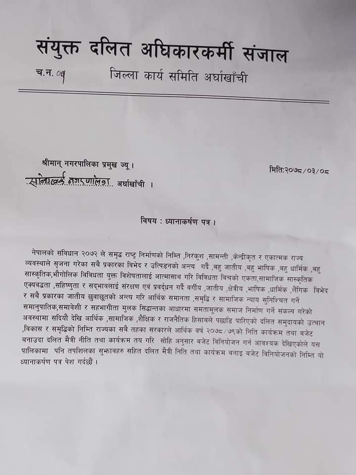 सन्धिखर्क, अर्घाखाँची (अर्घाखाँचीडट्कम) ८ असार । अर्घाखाँची जिल्लाको सन्धिखर्क नगरपालिकामा संयुक्त दलित अधिकार कर्मी सञ्जाल अर्घाखाँचीले विभिन्न माग राख्दै ध्यानाकर्षण पत्र बुझाएको छ ।