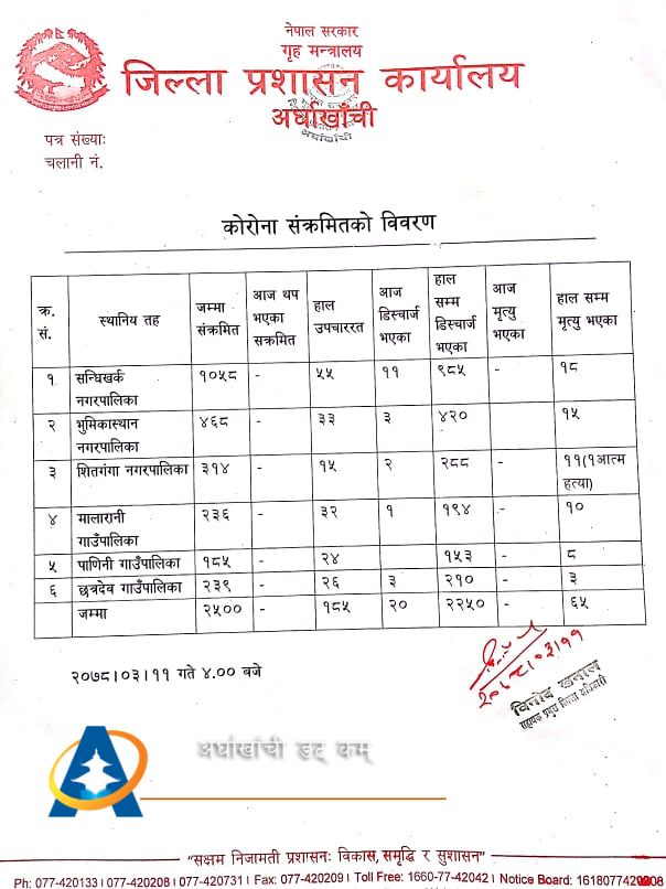 सन्धिखर्क, अर्घाखाँची (अर्घाखाँचीडट्कम) । अर्घाखाँची जिल्लामा पछिल्लो २४ घण्टामा थप कोही पनि कोरोना संक्रमित थपिएनन् ।