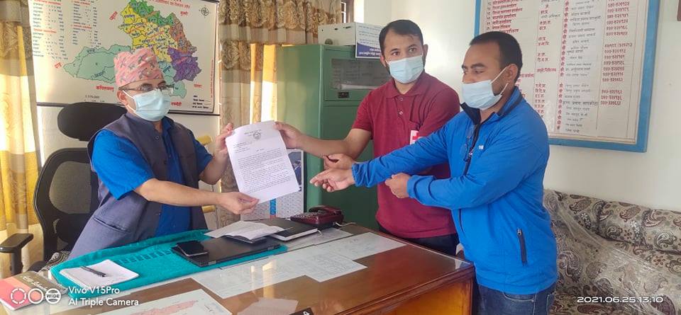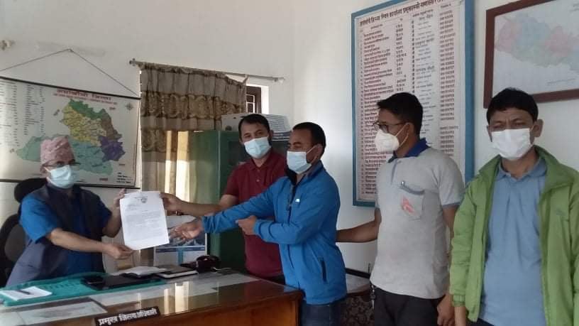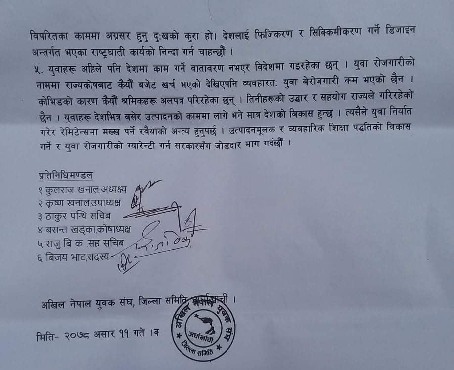 ज्ञापनपत्र युवक सङ्घका जिल्ला उपाध्यक्ष कृष्ण खनाल सचिब ठाकुर पंथी सुनार , कोषाध्यक्ष बसन्त खड्का ,र सहसचिव राजु सुनार सहितको प्रतिनिधि मण्डलले ज्ञापन पत्र बुझाएको थियो ।