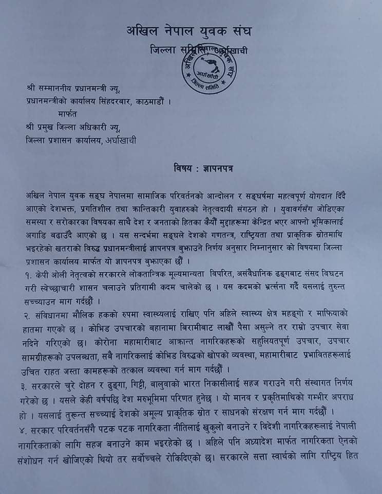 सन्धिखर्क, अर्घाखाँची (अर्घाखाँचीडट्कम) । अर्घाखाँची जिल्ला प्रशासन कार्यालय मार्फत नेकपा मसाल निकट अखिल नेपाल युवक संघ जिल्ला समिती अर्घाखाँचीले प्रधानमन्त्रीलाई ज्ञापनपत्र बुझाएको छ ।
